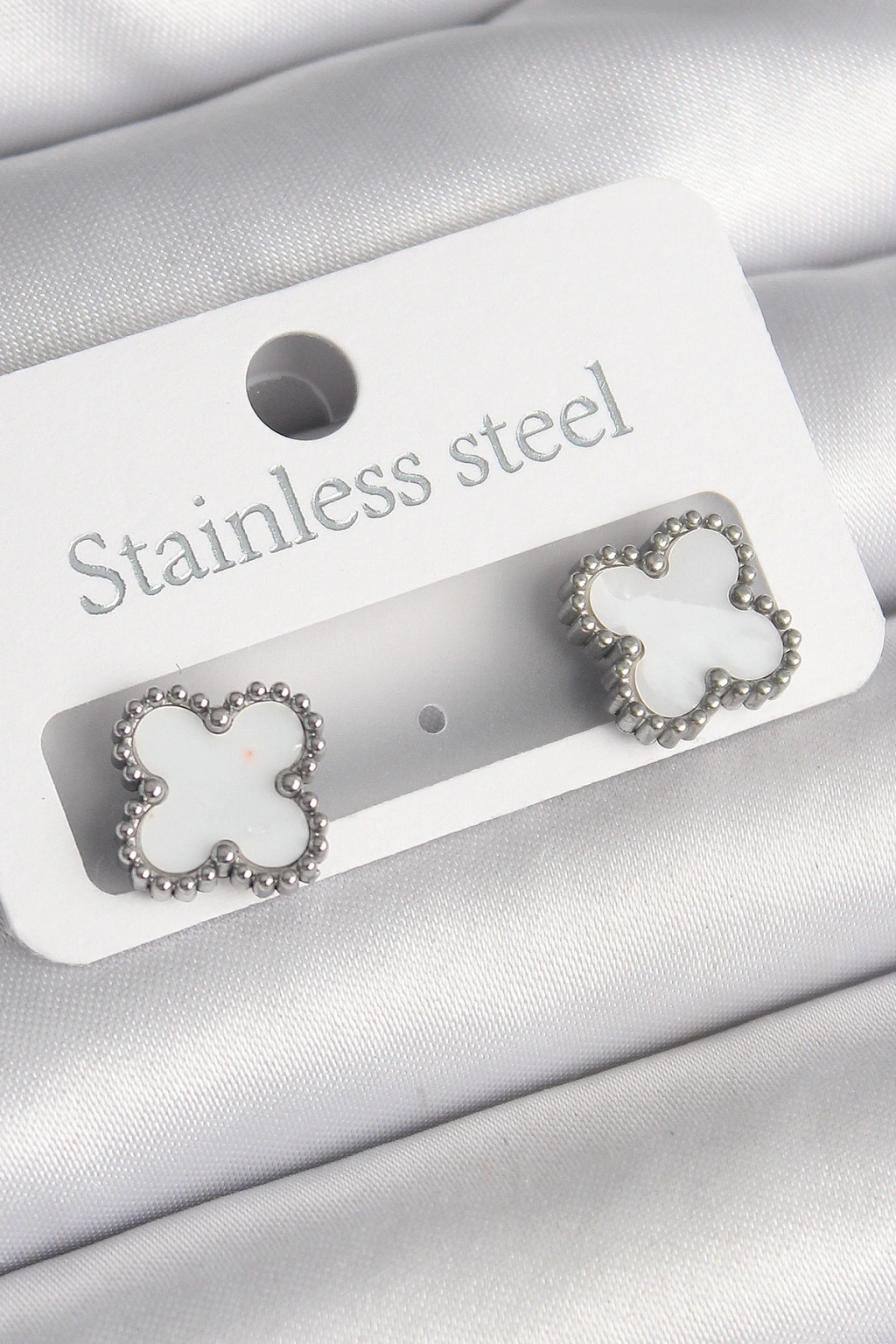 316l Çelik Gümüş Renk Beyaz Yonca Model Kadın Küpe