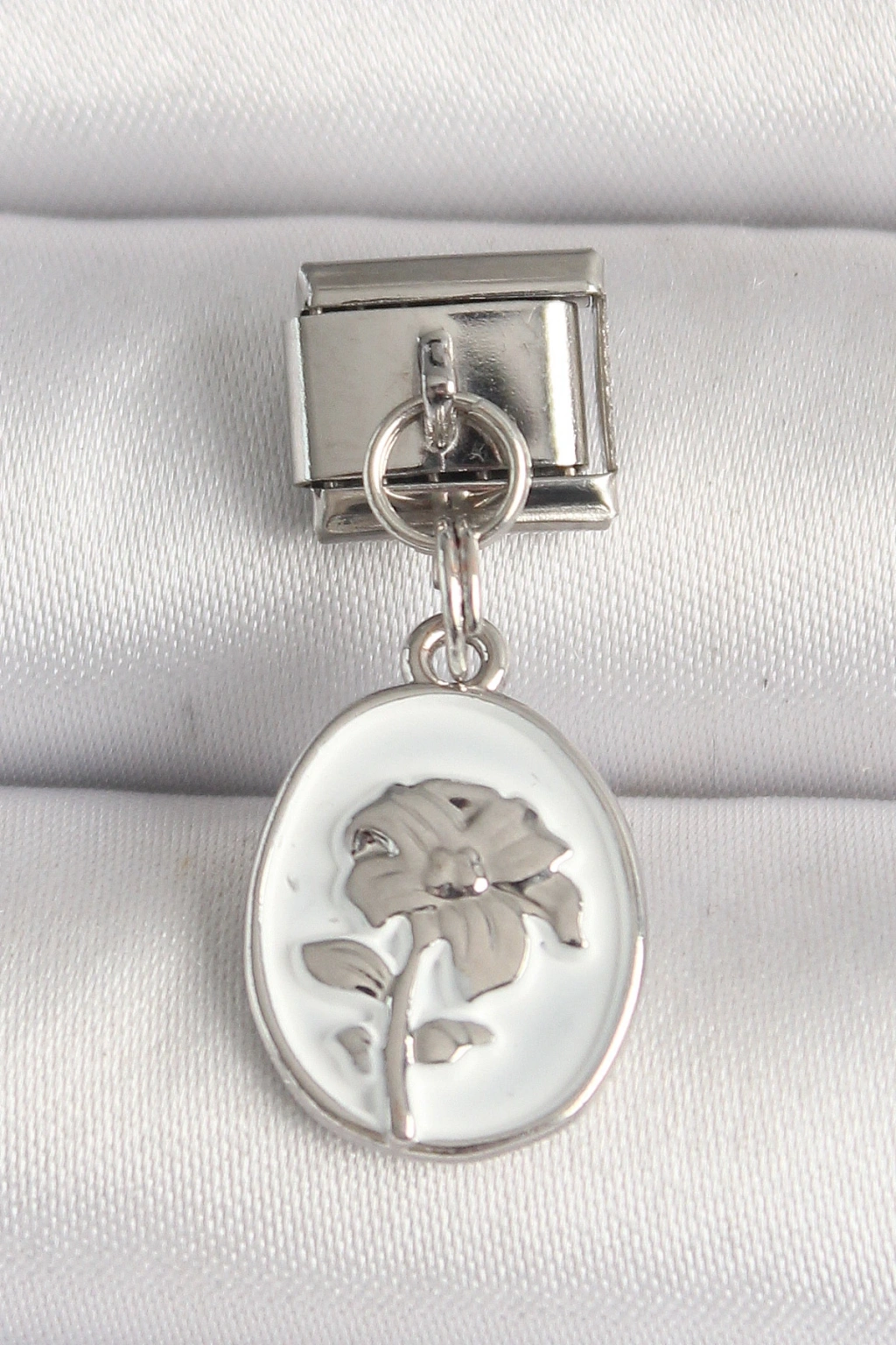 316l Çelik Gümüş Renk Çiçek İşlemeli Beyaz Portre Model Nomination Charm