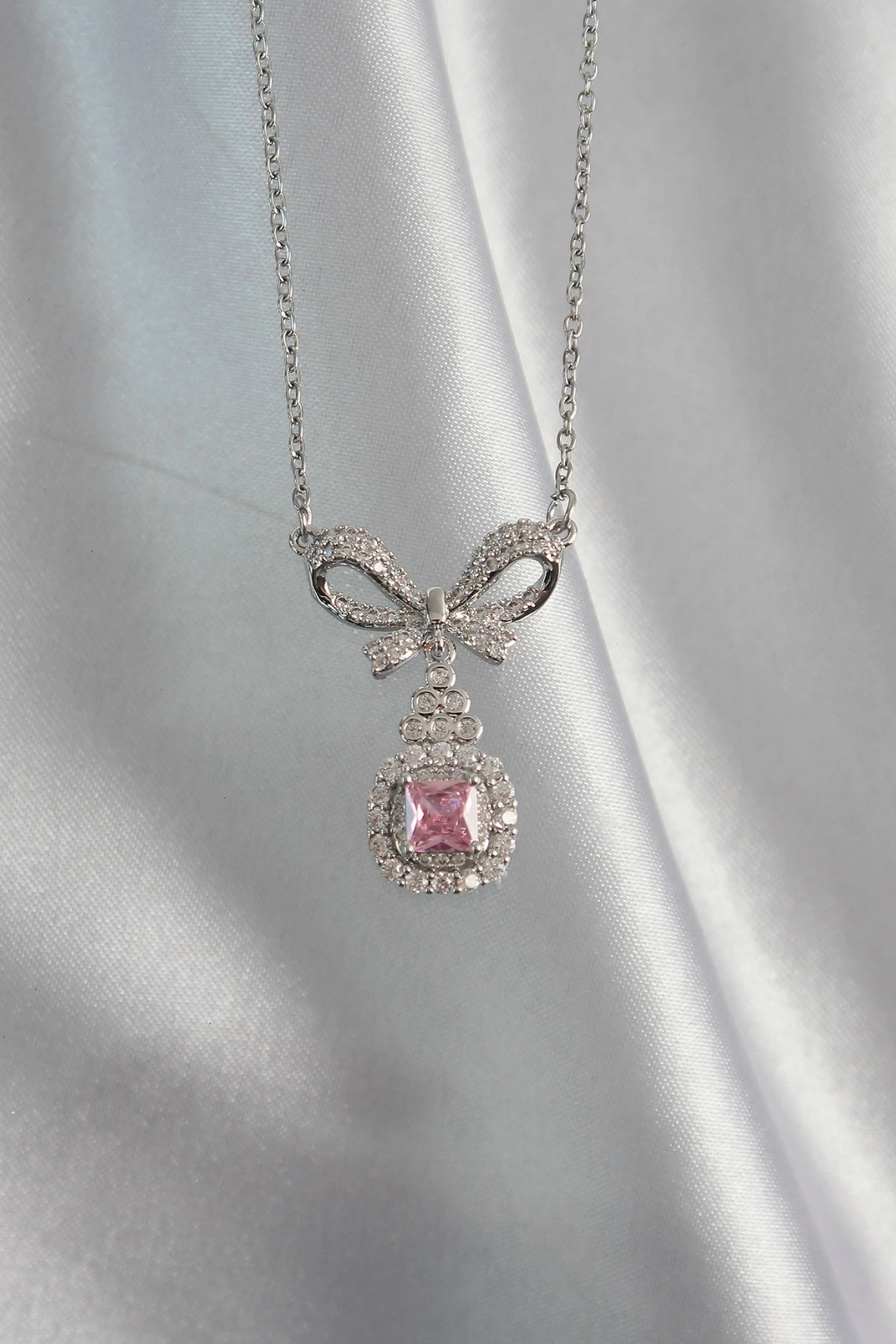 316l Çelik Gümüş Renk Fiyonk Detay Pembe Zirkon Taşlı Tektaş Kolye