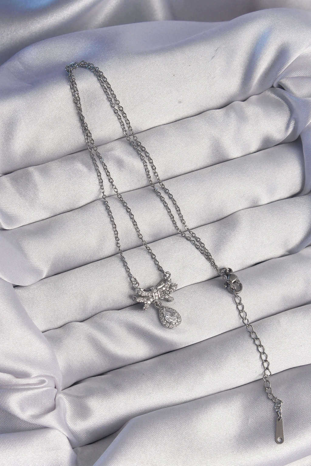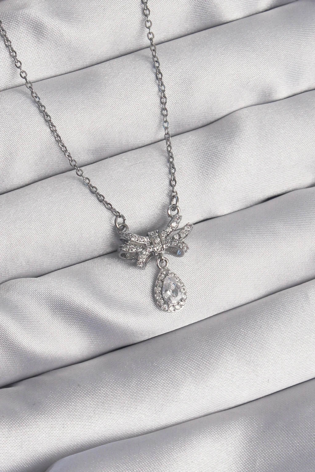 316l Çelik Gümüş Renk Fiyonk Detaylı Zirkon Taşlı Damla Model Kolye