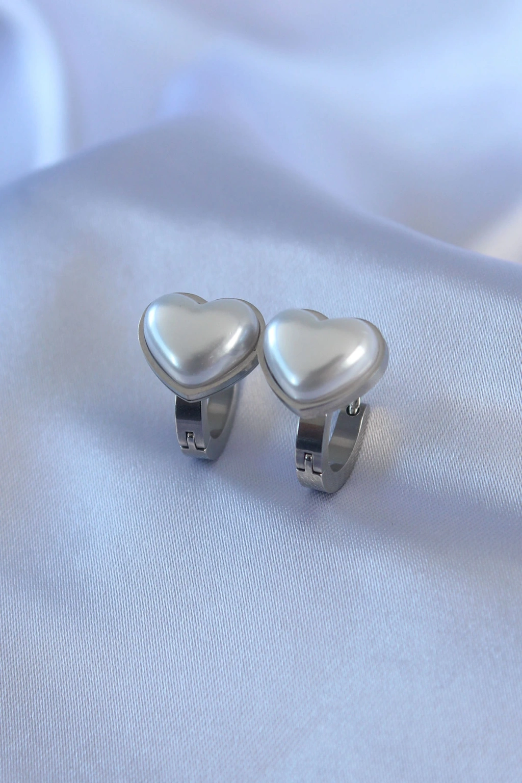 316l Çelik Gümüş Renk İncili Kalp Model Kadın Küpe