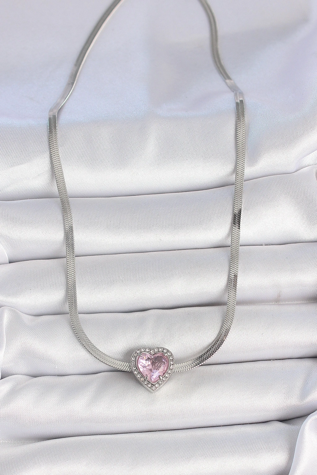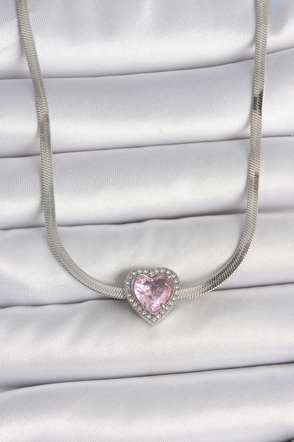 316L Çelik Gümüş Renk İtalyan Zincir Pembe Zirkon Taşlı Kalp Model Kadın Kolye