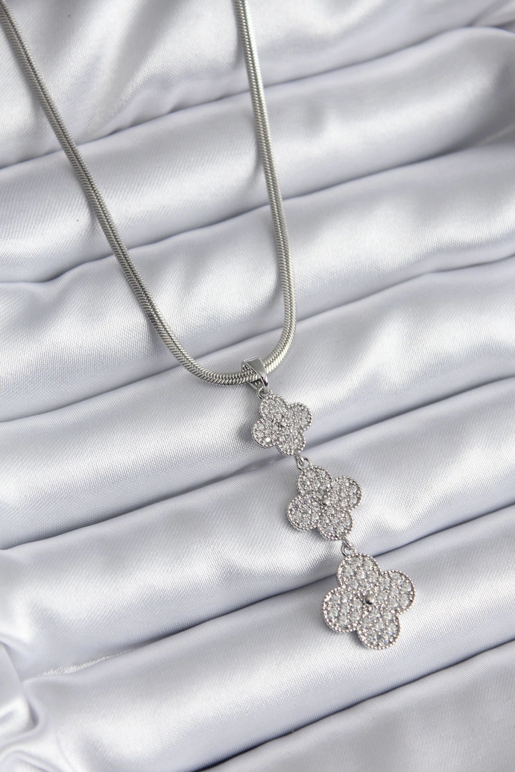 316l Çelik Gümüş Renk İtalyan Zincir Zirkon Taşı Yonca Model Kadın Kolye