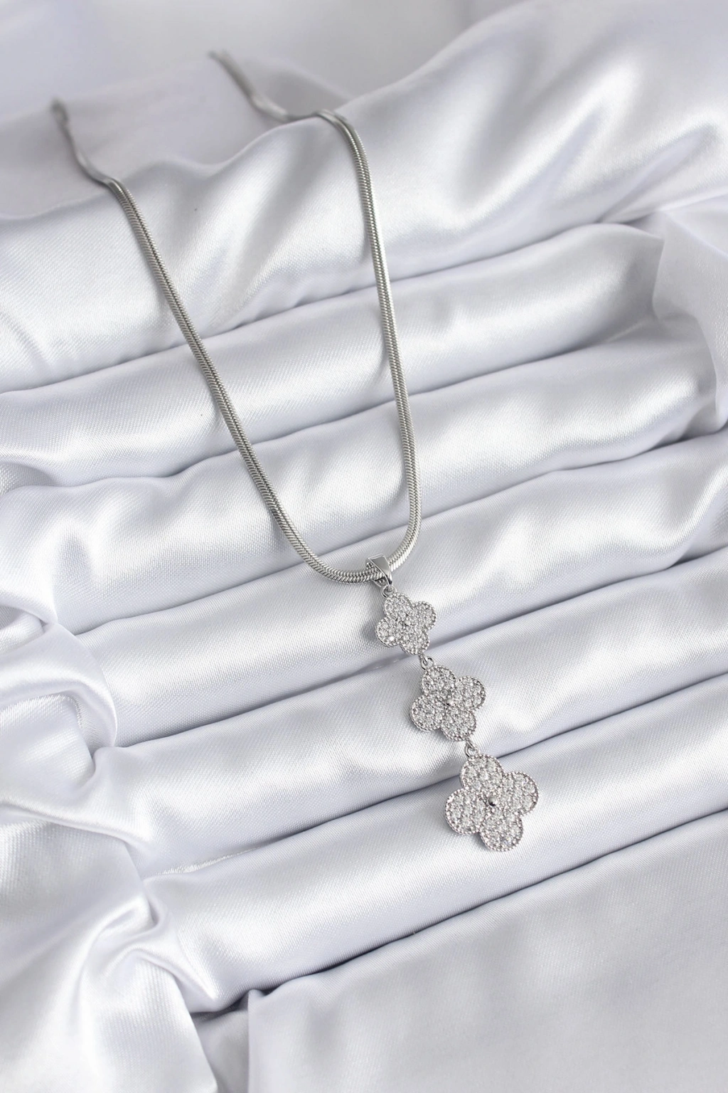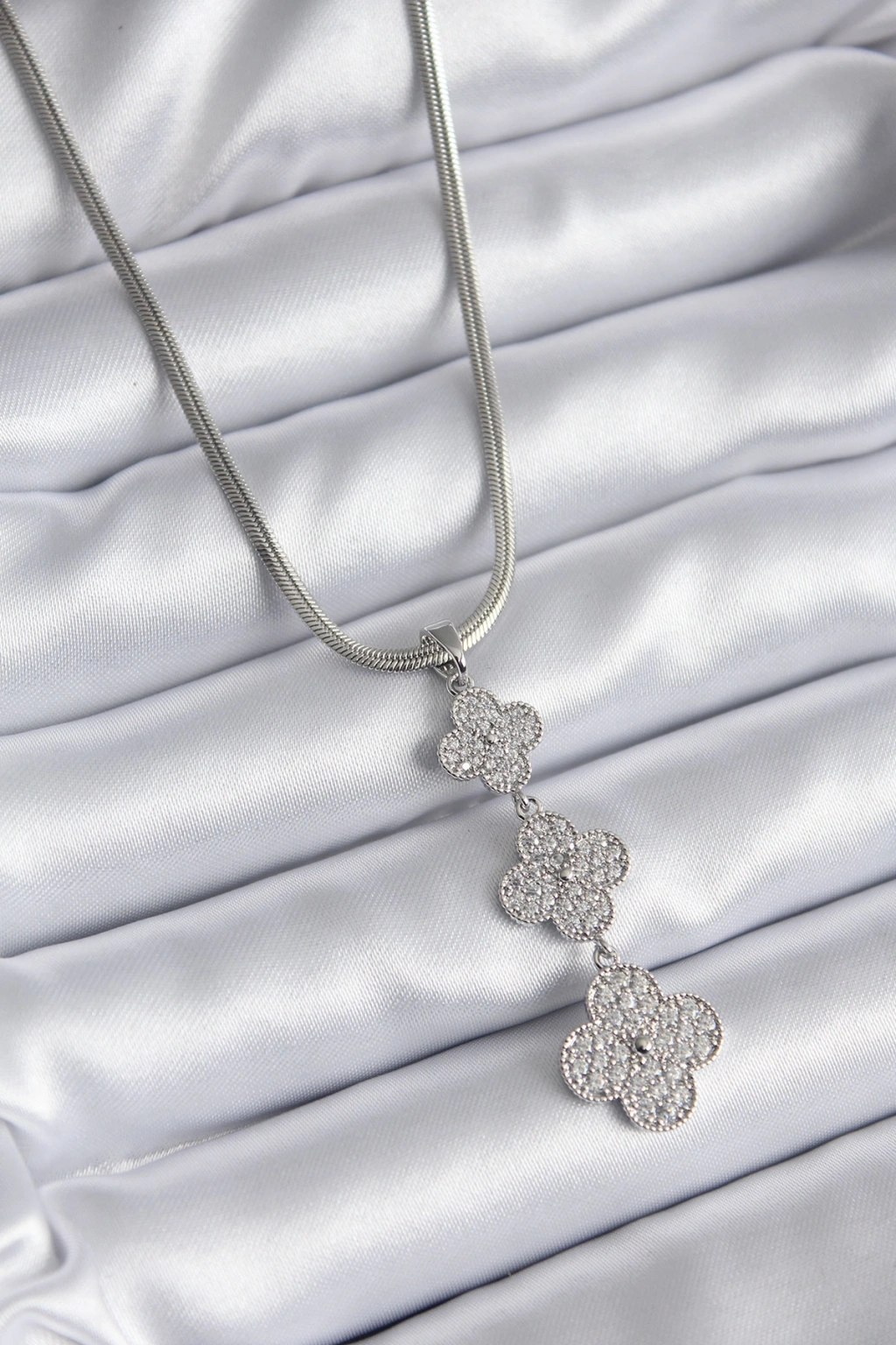 316L Çelik Gümüş Renk İtalyan Zincir Zirkon Taşı Yonca Model Kadın Kolye