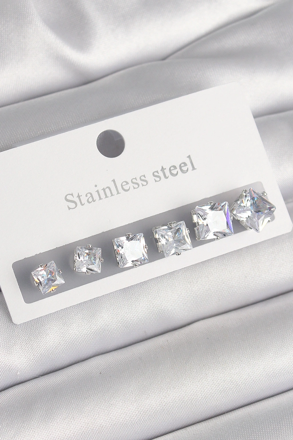 316l Çelik Gümüş Renk Kare Zirkon Taşlı Kadın Küpe Seti