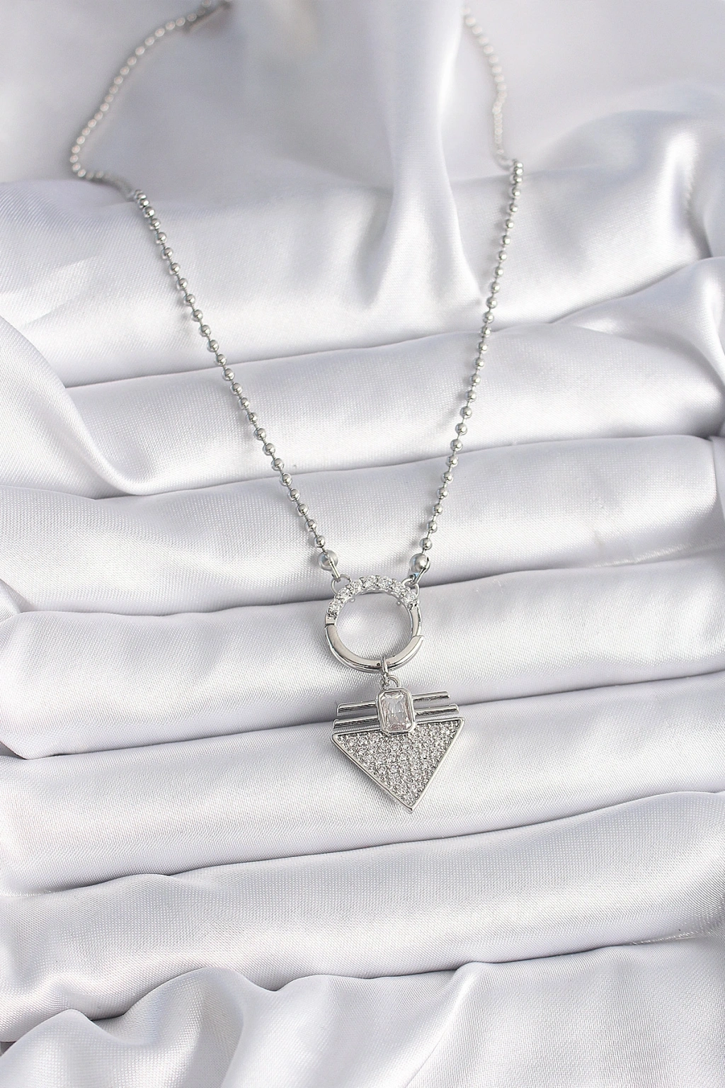 316L Çelik Gümüş Renk Topçuk Zincir Zirkon Taşlı Üçgen Model Kadın Kolye