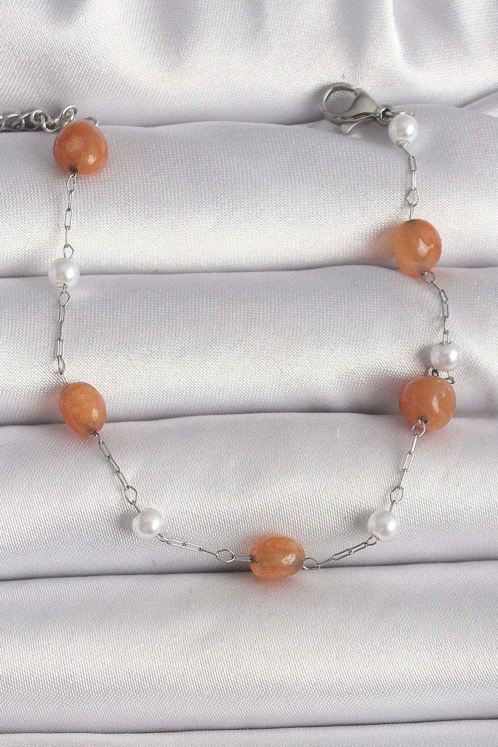 316l Çelik Gümüş Renk Turuncu Doğaltaş Model İnci Detay Kadın Bileklik