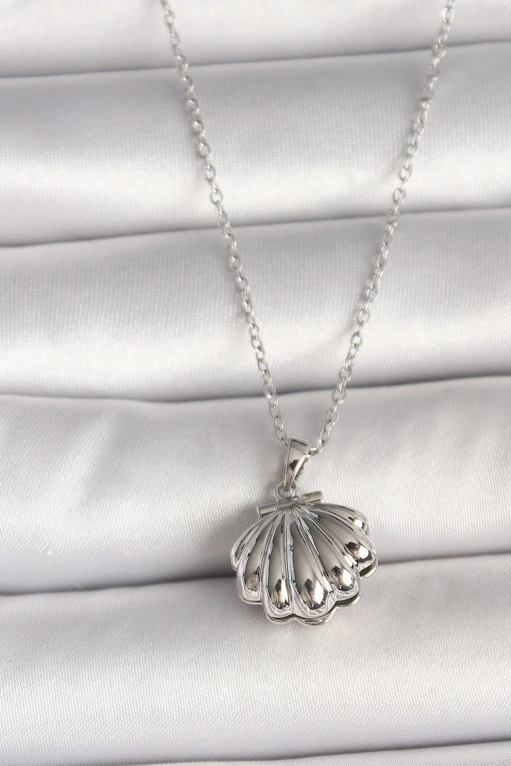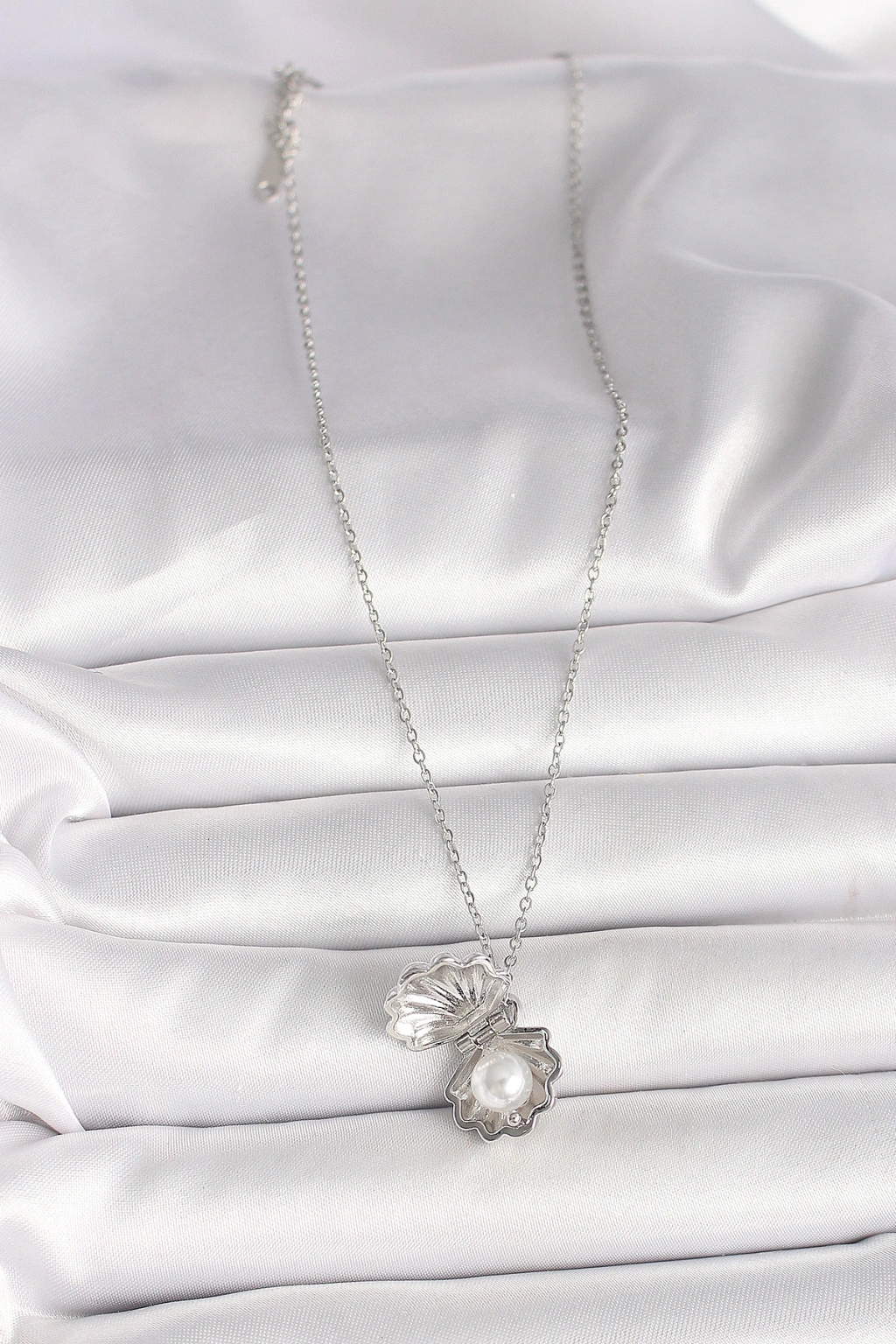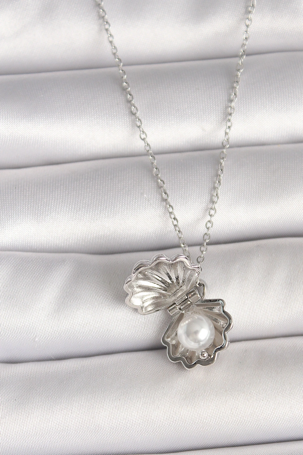 316l Çelik Gümüş Renk Zincir Açılır İncili Midye Model Kadın Kolye