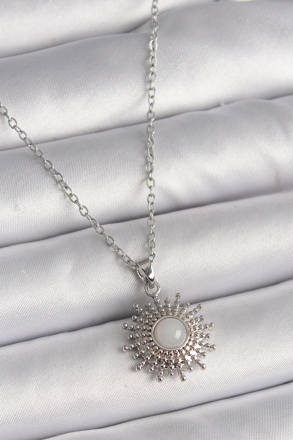 316L Çelik Gümüş Renk Zincir Beyaz Mineli Güneş Model Kadın Kolye