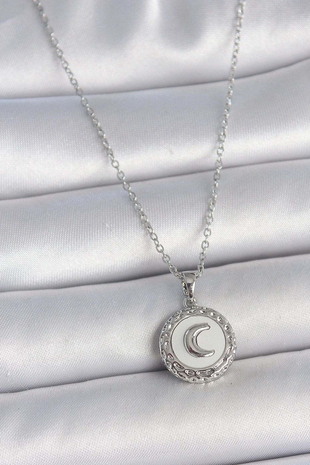 316l Çelik Gümüş Renk Zincir Beyaz Mineli Hilal İşlemeli Madalyon Model Kadın Kolye