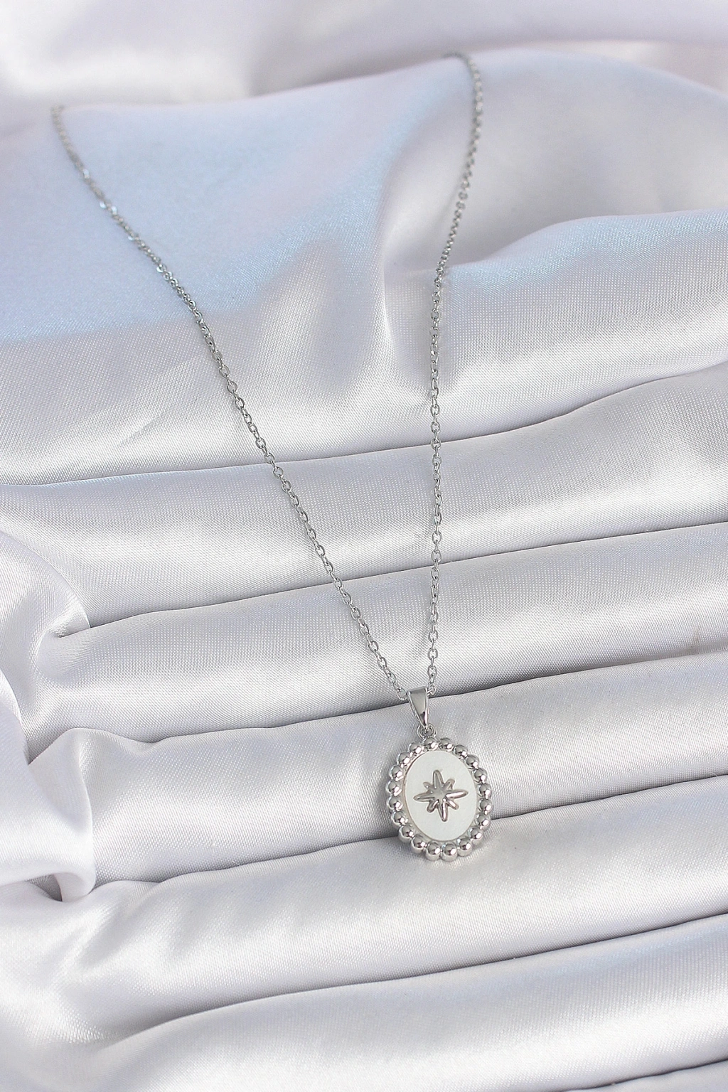 316l Çelik Gümüş Renk Zincir Beyaz Mineli Kutup Yıldız İşlemeli Madalyon Model Kadın Kolye