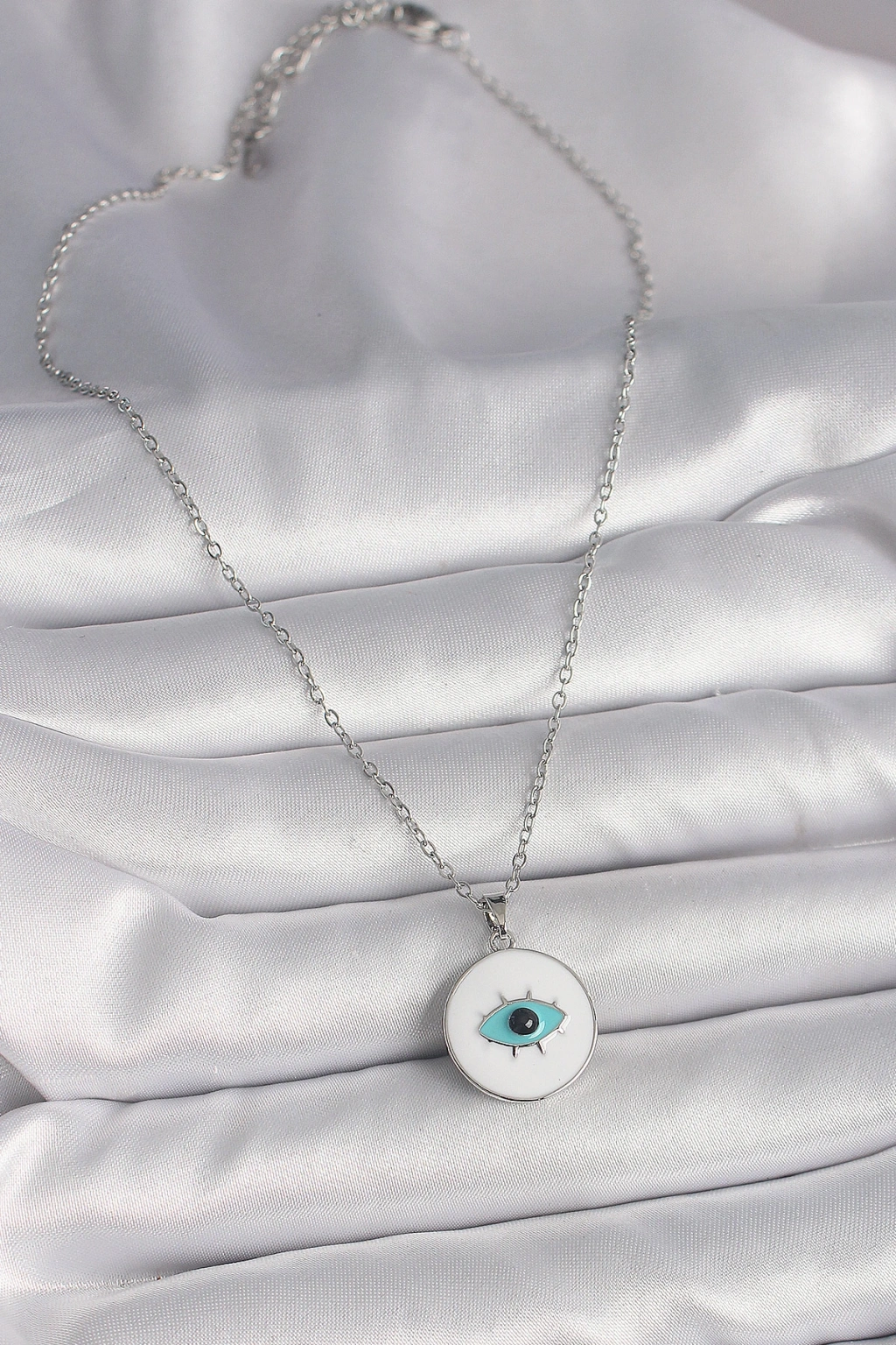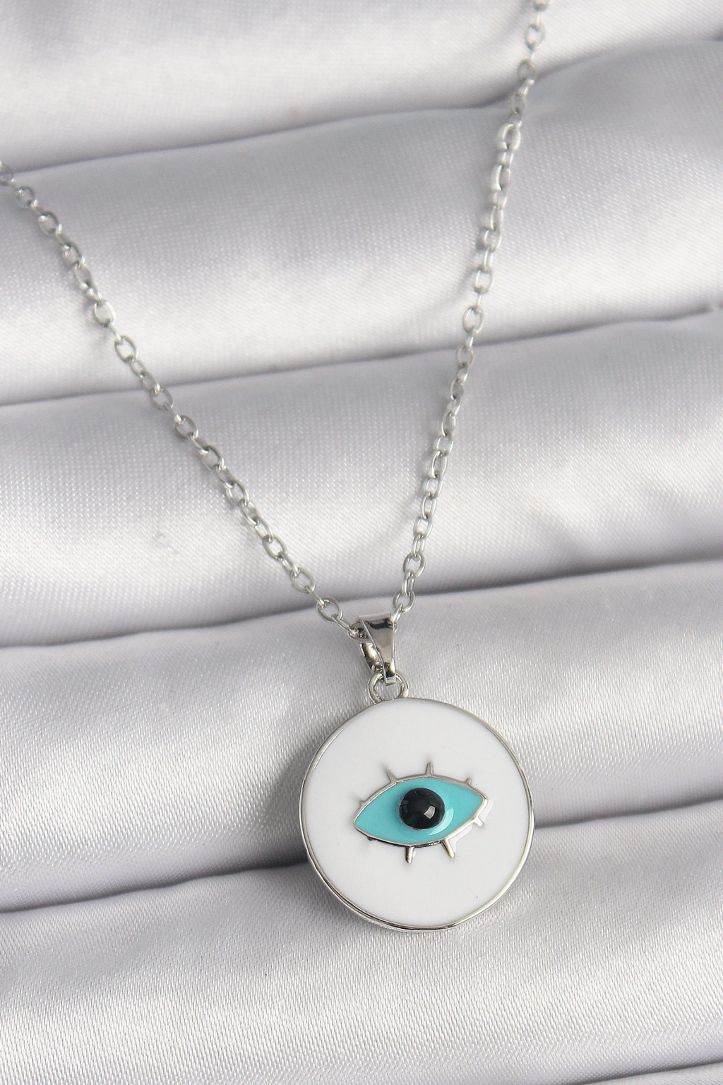 316l Çelik Gümüş Renk Zincir Beyaz Mineli Turkuaz Göz İşleme Model Kadın Kolye