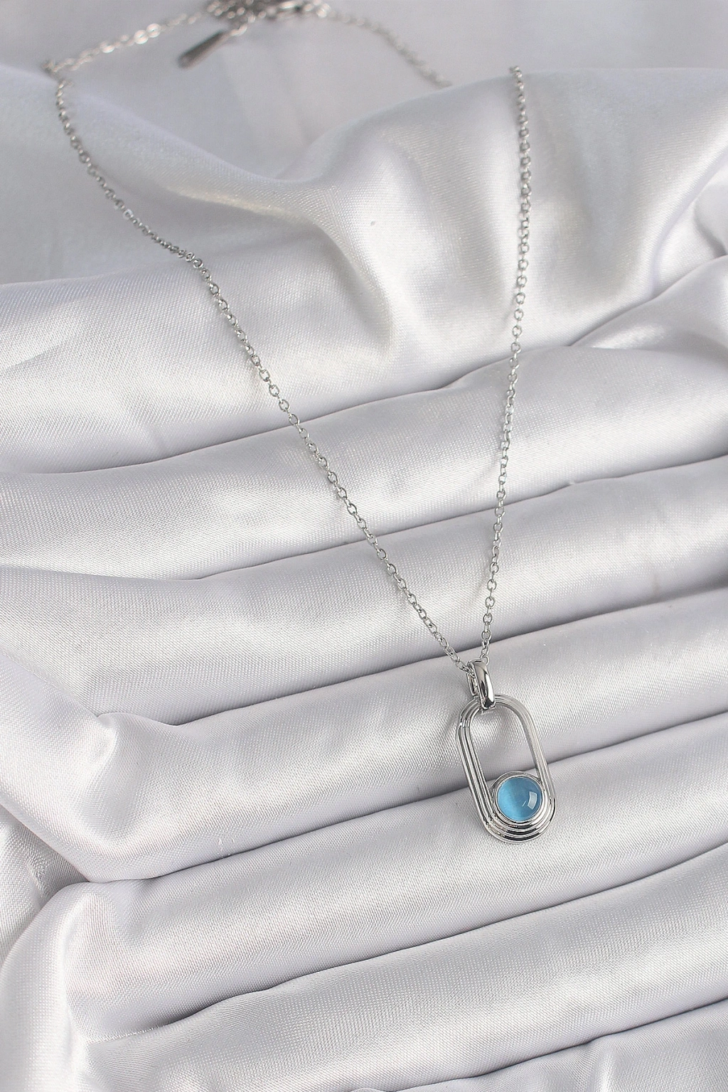316l Çelik Gümüş Renk Zincir Mavi Kedi Göz Model Kadın Kolye