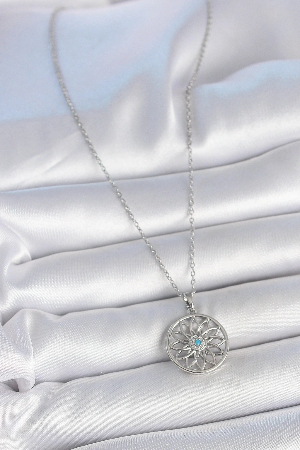 316l Çelik Gümüş Renk Zincir Mavi Taşlı Lotus Model Kadın Kolye