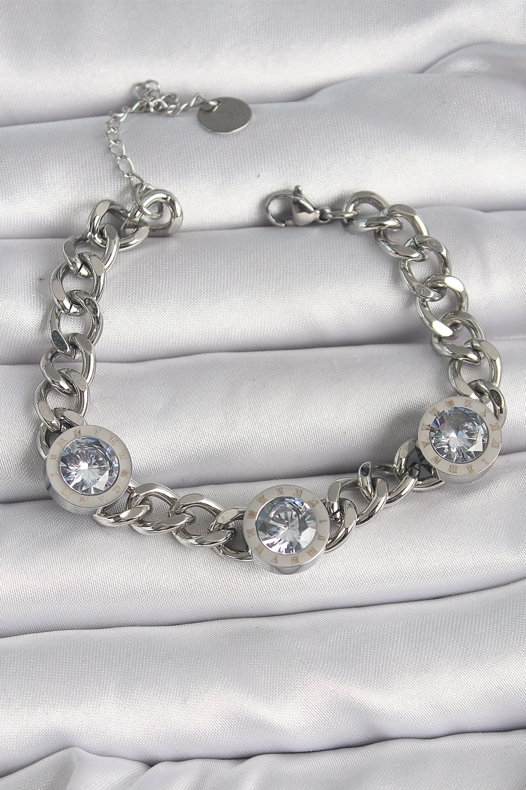 316l Çelik Gümüş Renk Zincir Model Zirkon Taşlı İşleme Detaylı Kadın Bileklik