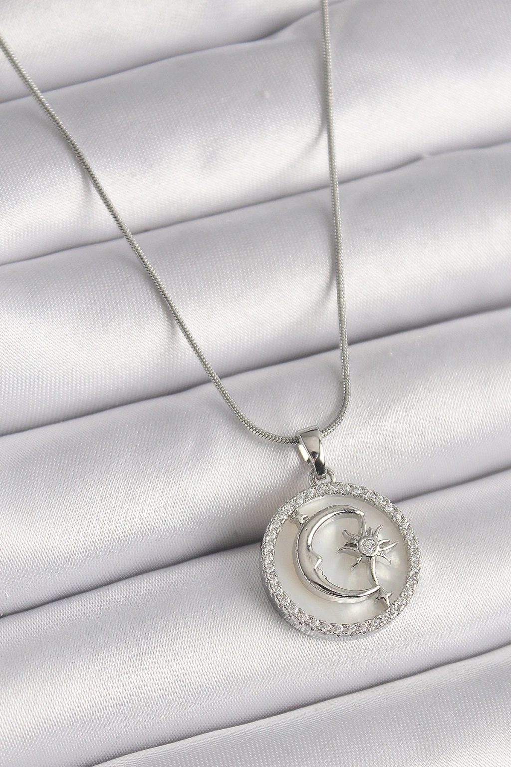 316l Çelik Gümüş Renk Zincir Zirkon Taş Detaylı Beyaz Sedefli Ay Yıldız İşleme Kadın Kolye