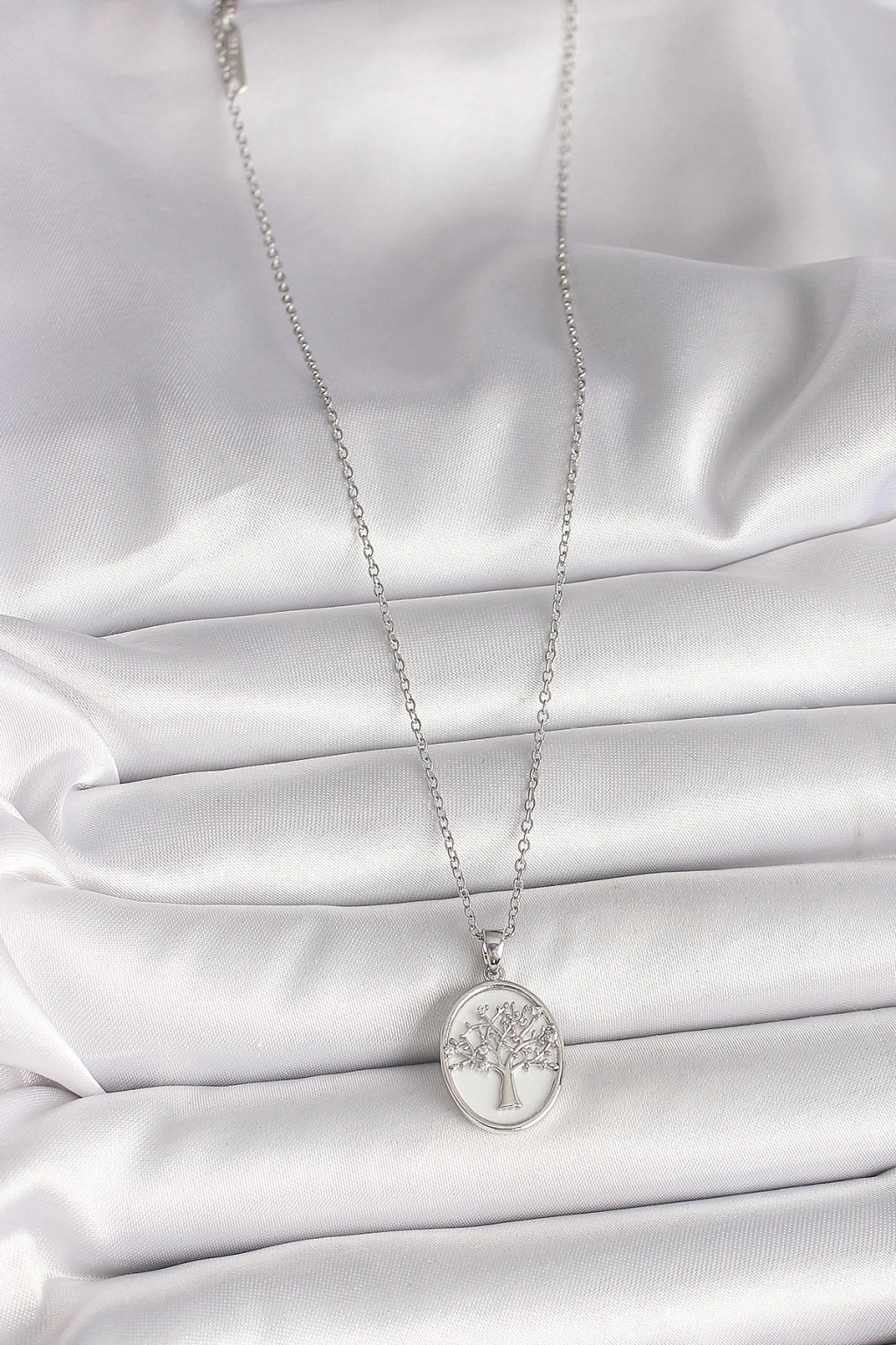 316L Çelik Gümüş Renk Zincir Zirkon Taş İşlemeli Beyaz Mineli Ağaç İşlemeli Portre Model Kadın Kolye
