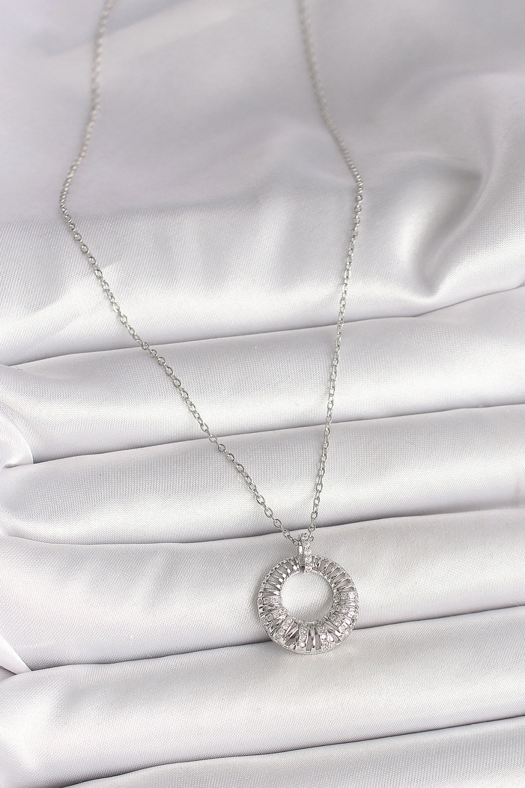 316l Çelik Gümüş Renk Zincir Zirkon Taş İşlemeli Daire Model Kadın Kolye