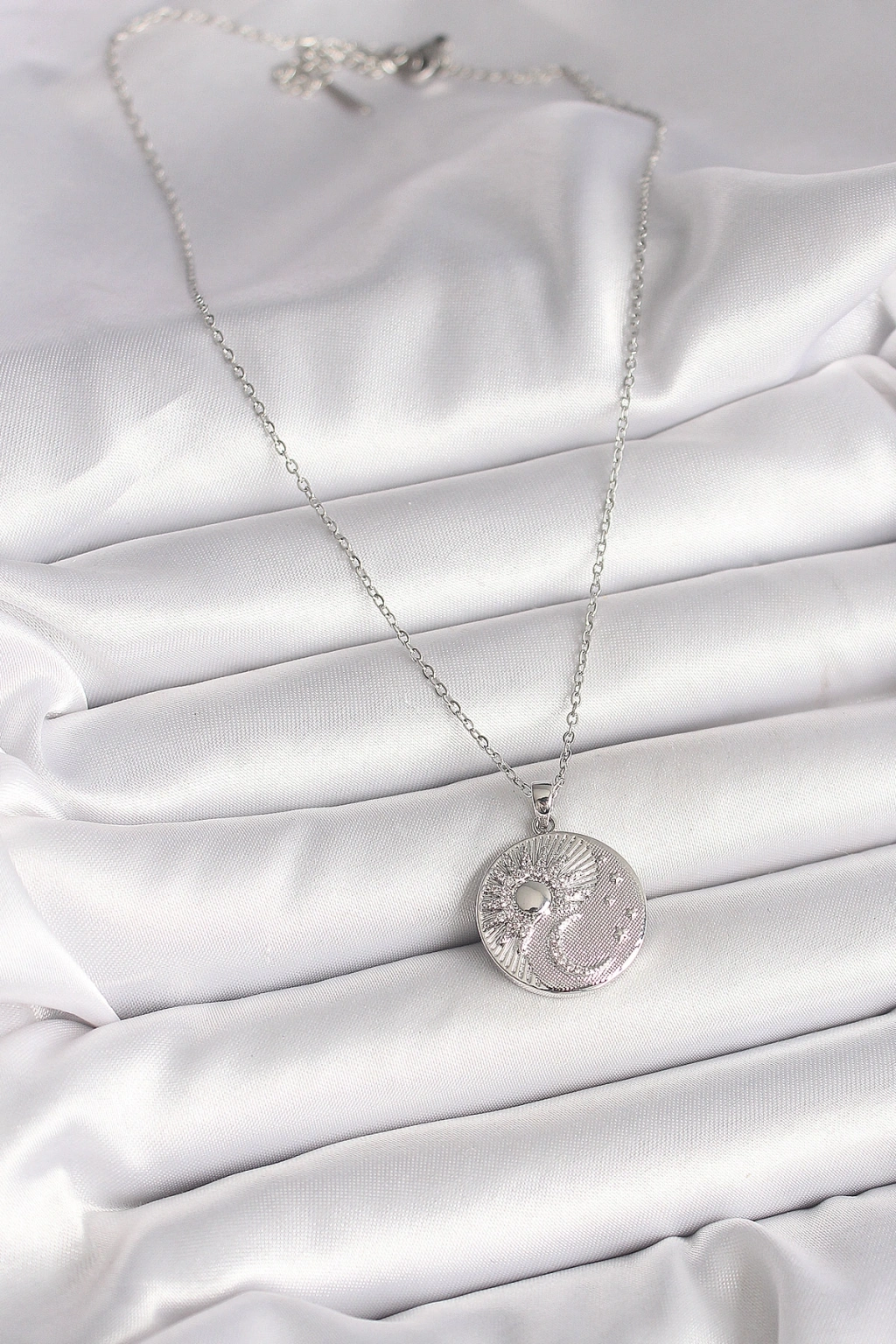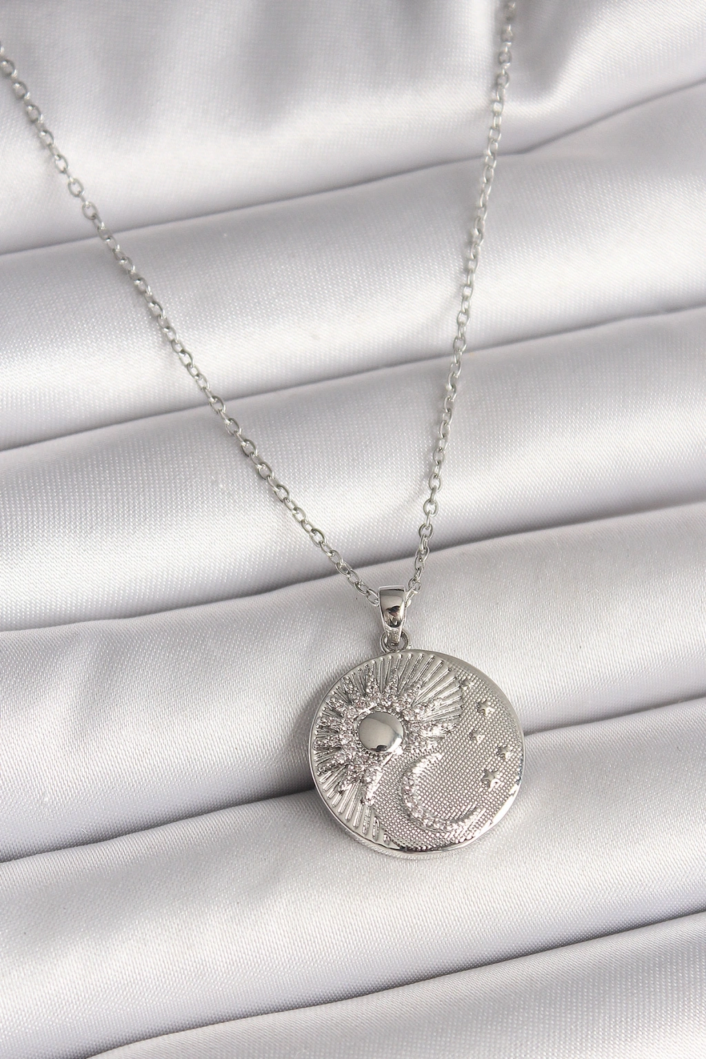 316L Çelik Gümüş Renk Zincir Zirkon Taşlı Ay Güneş İşlemeli Madalyon Model Kadın Kolye