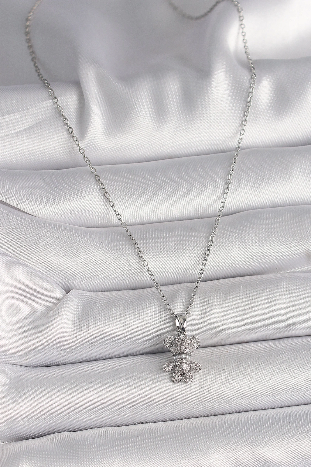 316L Çelik Gümüş Renk Zincir Zirkon Taşlı Ayıcık Figür Kadın Kolye