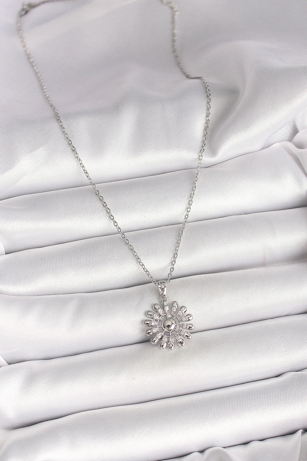 316l Çelik Gümüş Renk Zincir Zirkon Taşlı Güneş Model Kadın Kolye