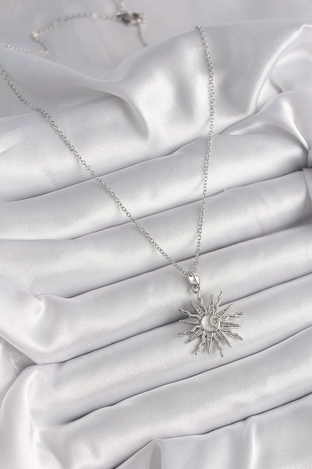 316l Çelik Gümüş Renk Zincir Zirkon Taşlı Güneş Model Sedefli Ay İşleme Detay Kadın Kolye
