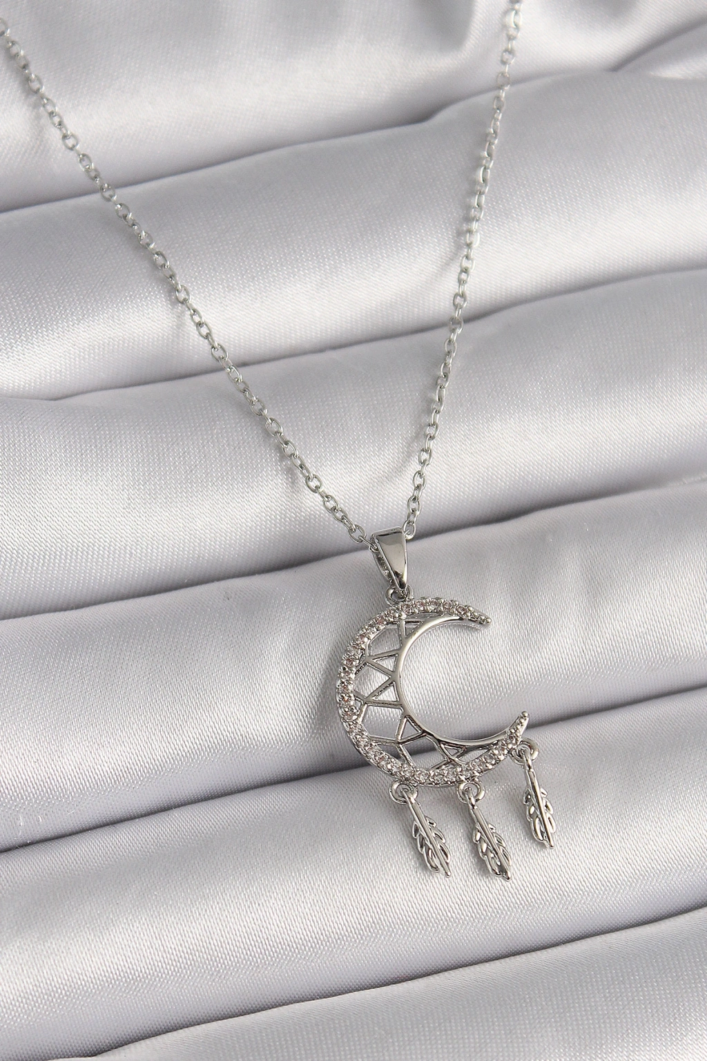 316l Çelik Gümüş Renk Zincir Zirkon Taşlı Hilal Model Sallantı Yaprak Detay Kadın Kolye