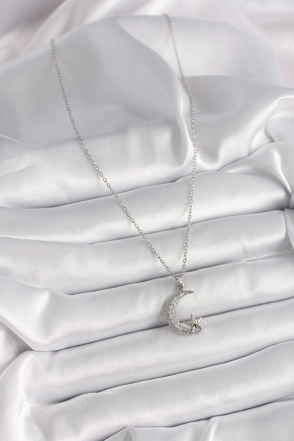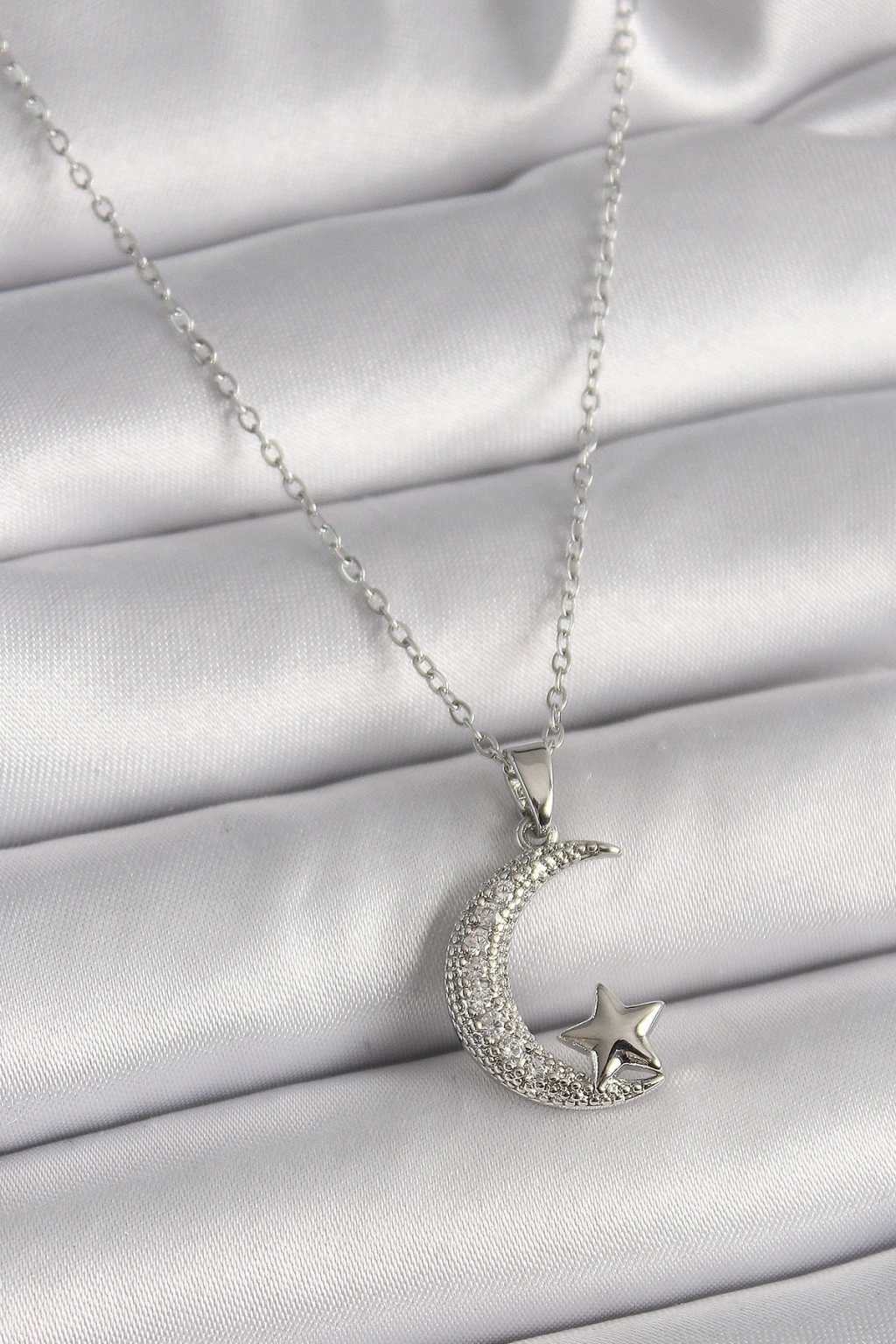 316l Çelik Gümüş Renk Zincir Zirkon Taşlı Hilal Model Yıldız Detay Kadın Kolye