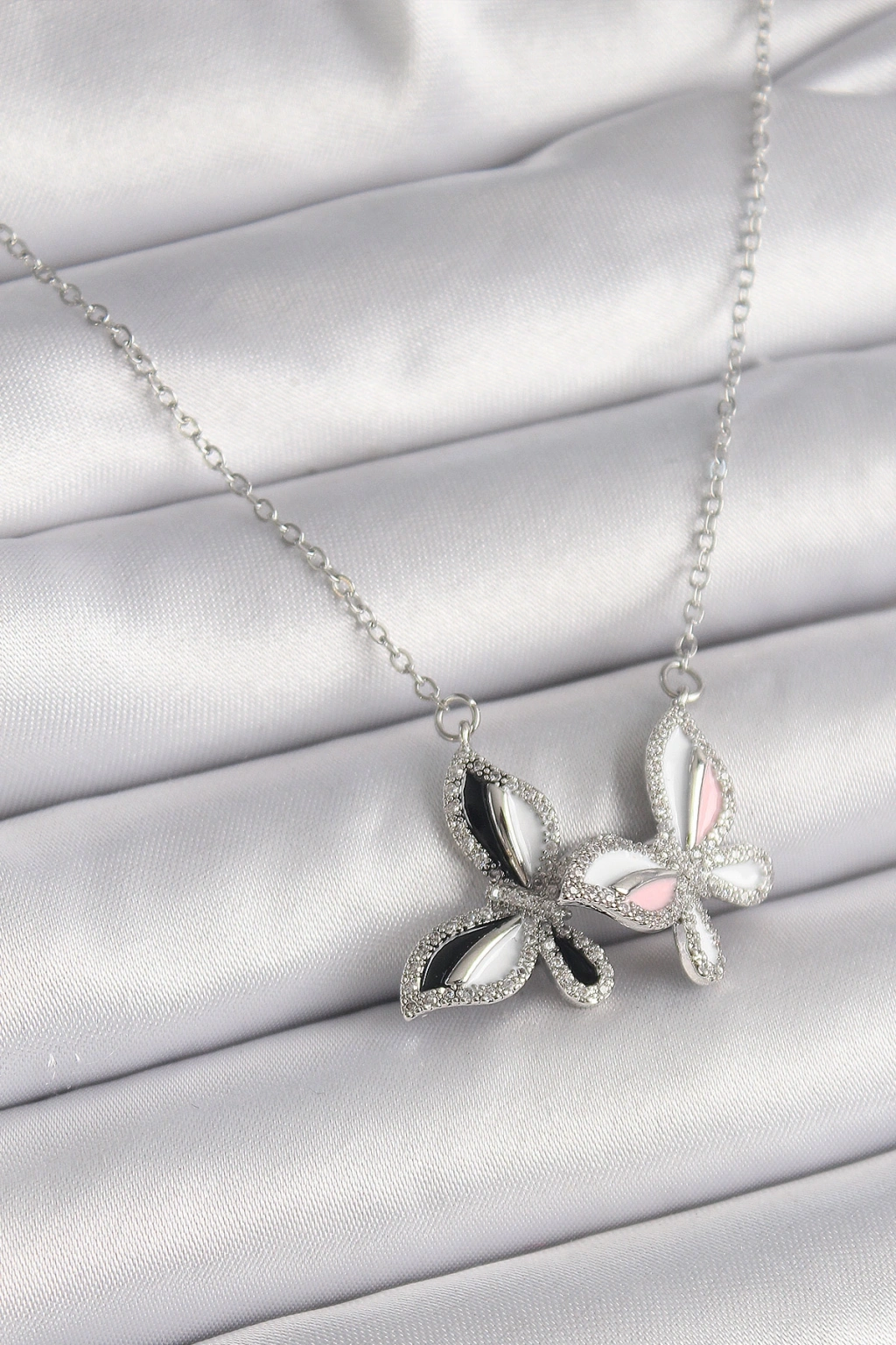 316L Çelik Gümüş Renk Zincir Zirkon Taşlı Renkli Kelebek Model Kadın Kolye