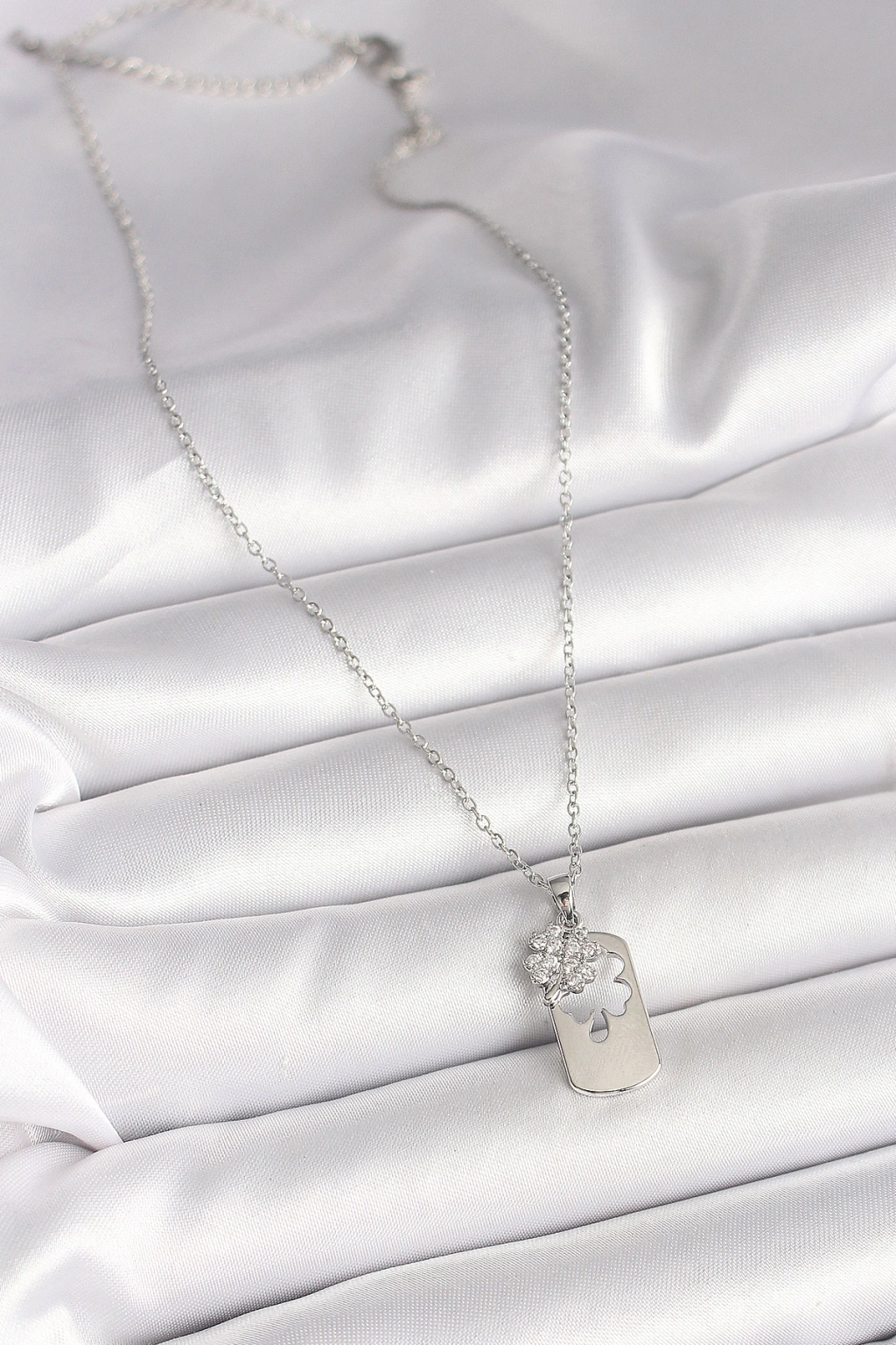 316L Çelik Gümüş Renk Zincir Zirkon Taşlı Yonca Model Kadın Kolye