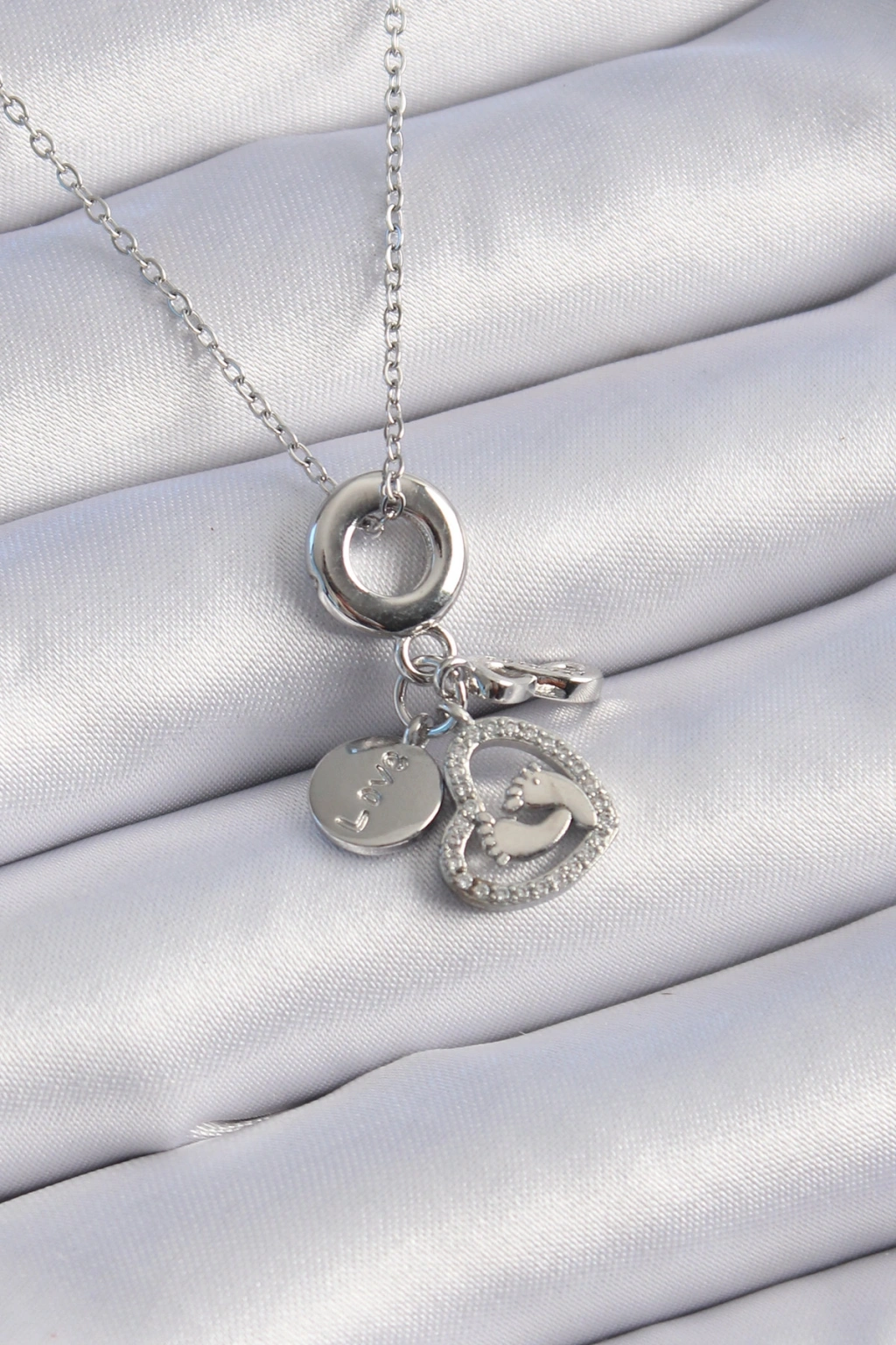 316L Çelik Gümüş Renk Zincir Zirkon Taşlı Düğüm Sallantı Kalp Figür Kadın Kolye