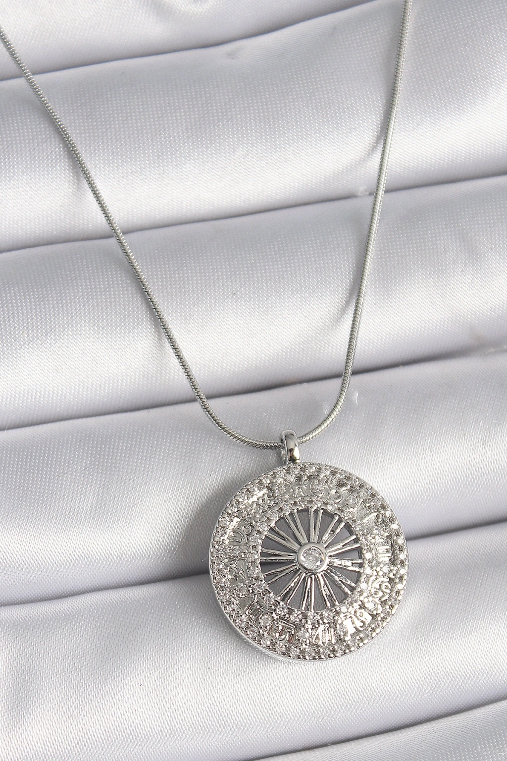 316L Çelik Gümüş Renk Zirkon Taşlı 12 Burç Madalyon Model Kadın Kolye