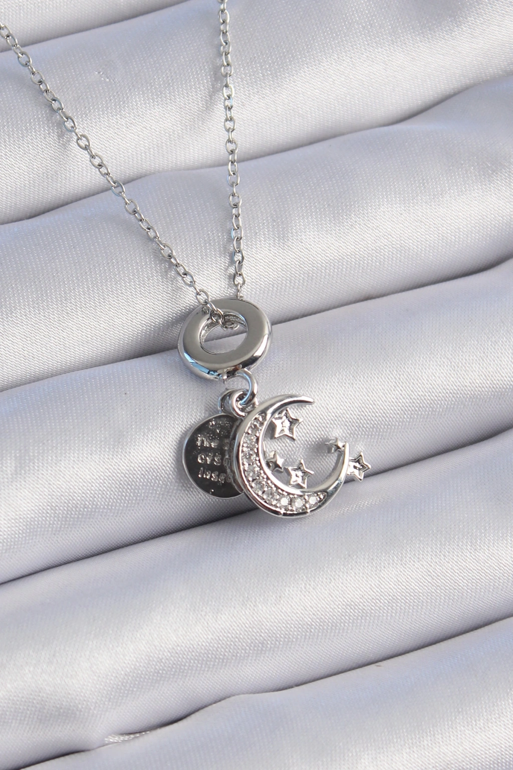 316L Çelik Gümüş Renk Zirkon Taşlı Ay Yıldız Figür Charm Model Kadın Kolye