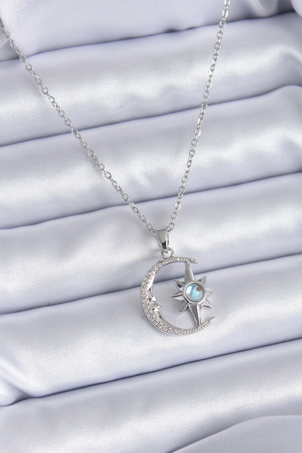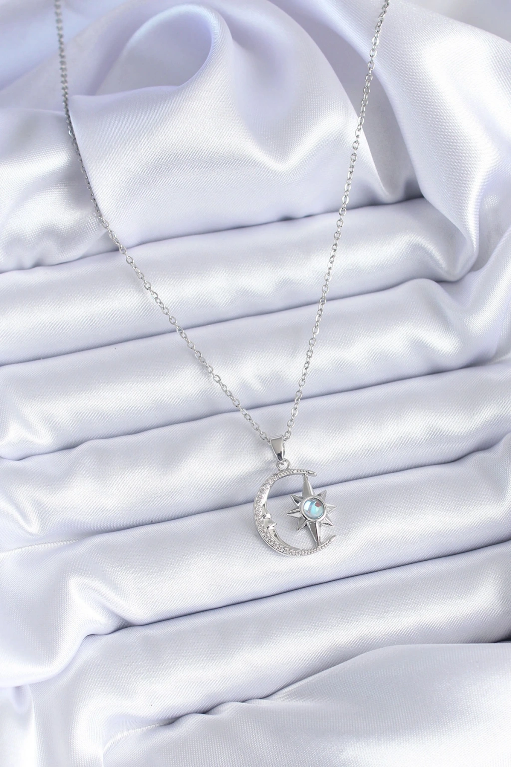 316l Çelik Gümüş Renk Zirkon Taşlı Ay Yıldız Model Kadın Kolye