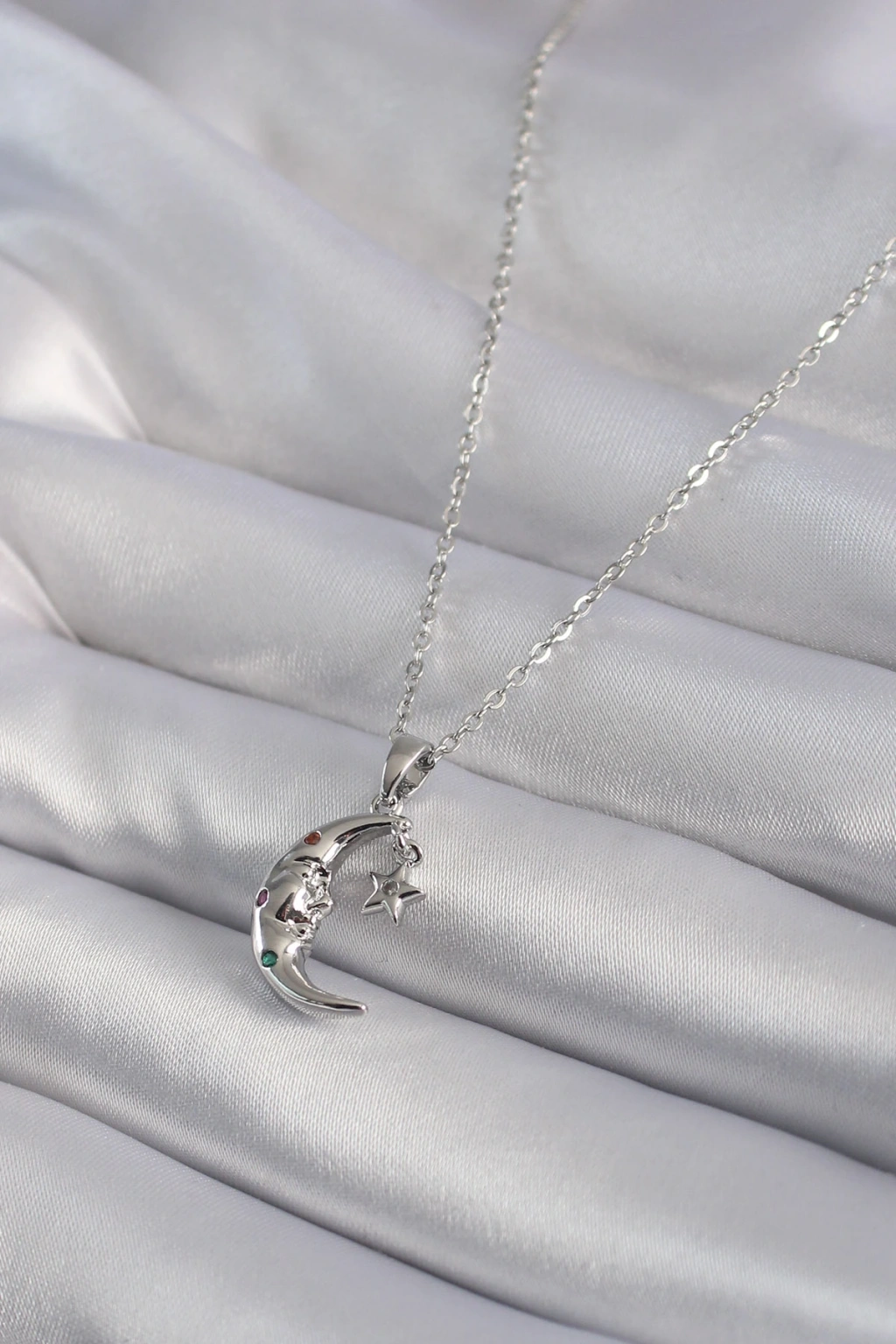 316l Çelik Gümüş Renk Zirkon Taşlı Ay Yıldız Model Kadın Kolye