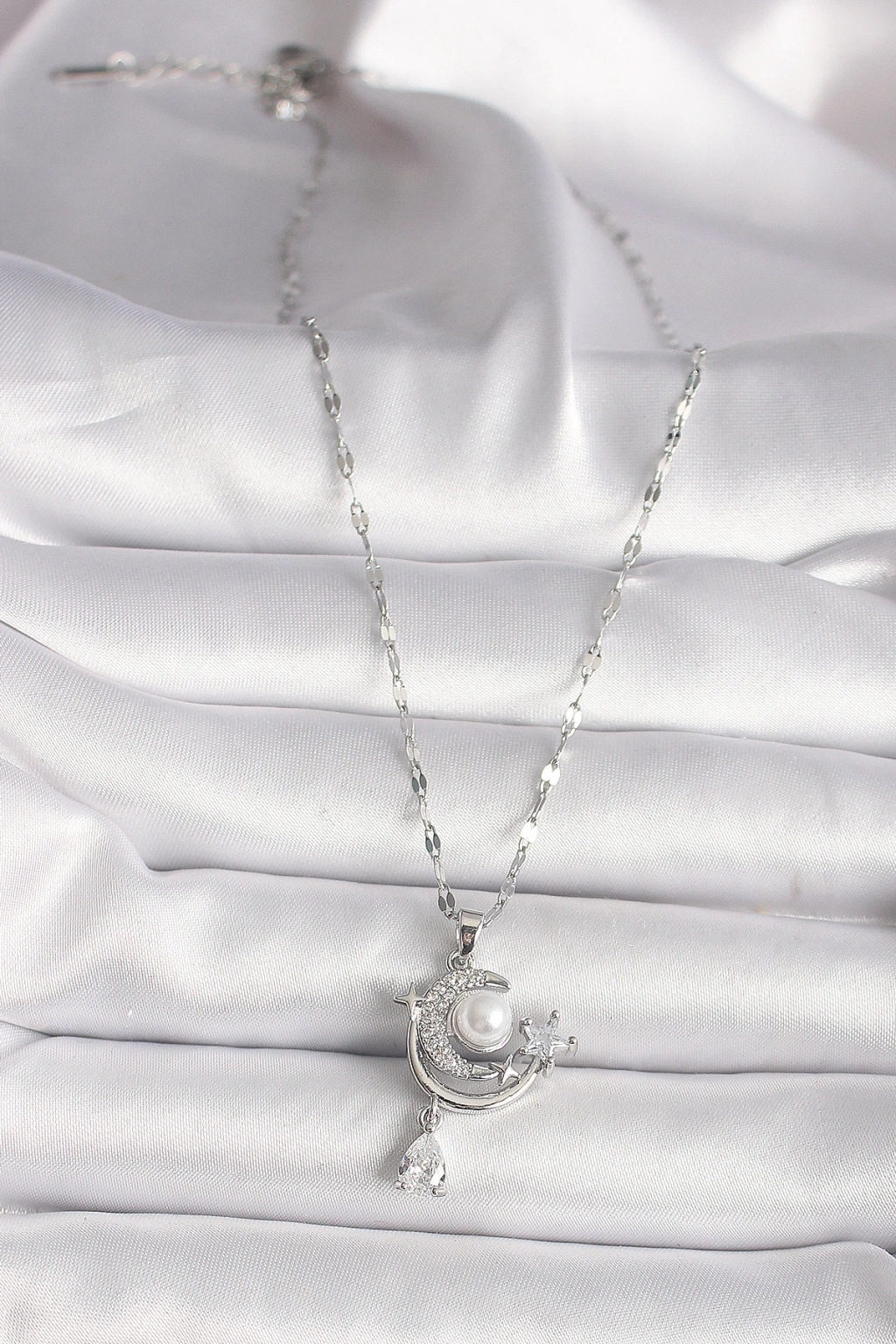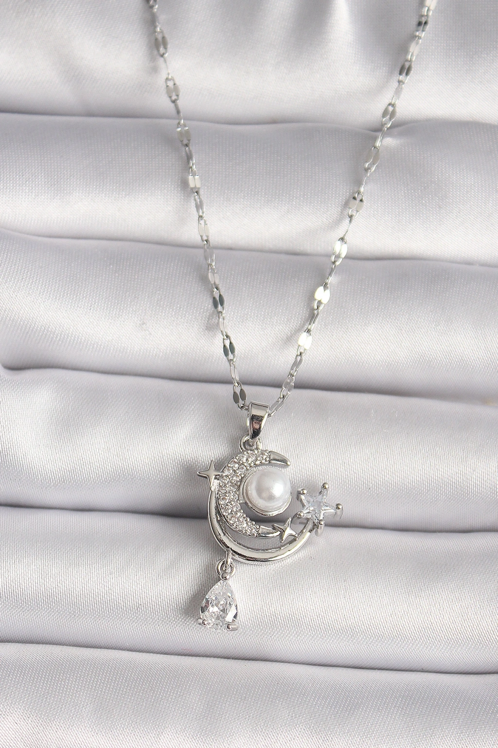 316l Çelik Gümüş Renk Zirkon Taşlı Ay Yıldız Sallantı Detay Kadın Kolye