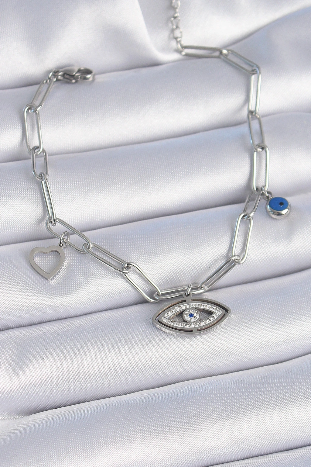 316l Çelik Gümüş Renk Zirkon Taşlı Göz Figür Kalp Detay Kadın Bileklik