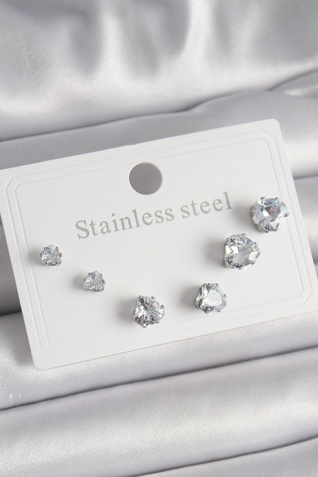 316l Çelik Gümüş Renk Zirkon Taşlı Kalp Model Kadın Küpe Seti