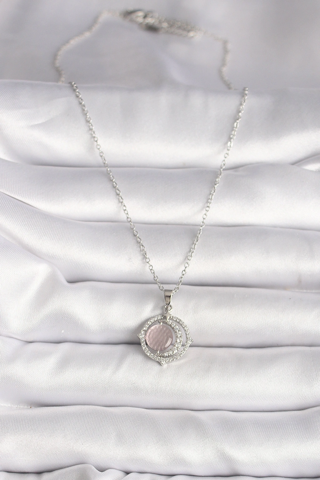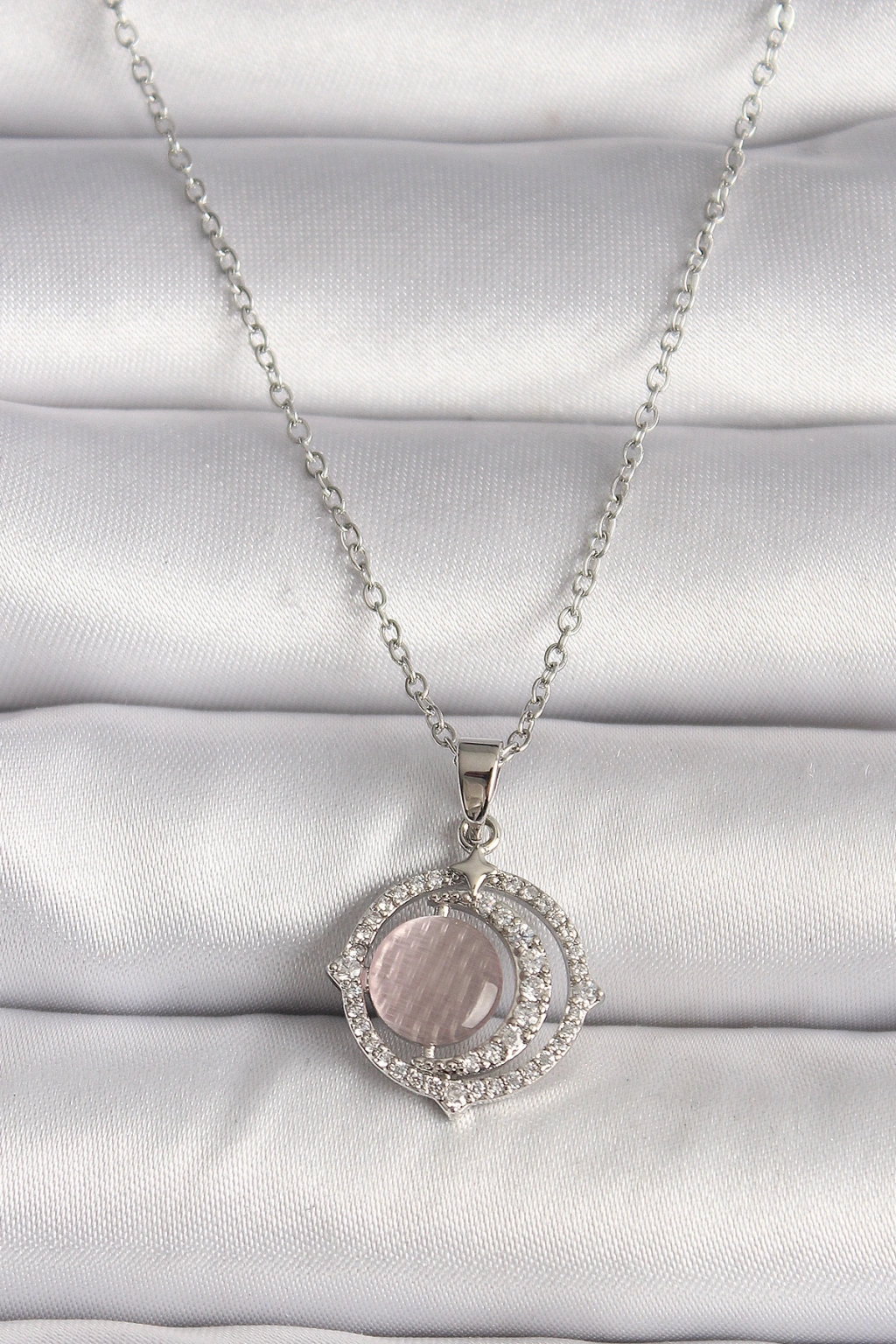 316L Çelik Gümüş Renk Zirkon Taşlı Pembe Sedefli Hilal Model Kadın Kolye