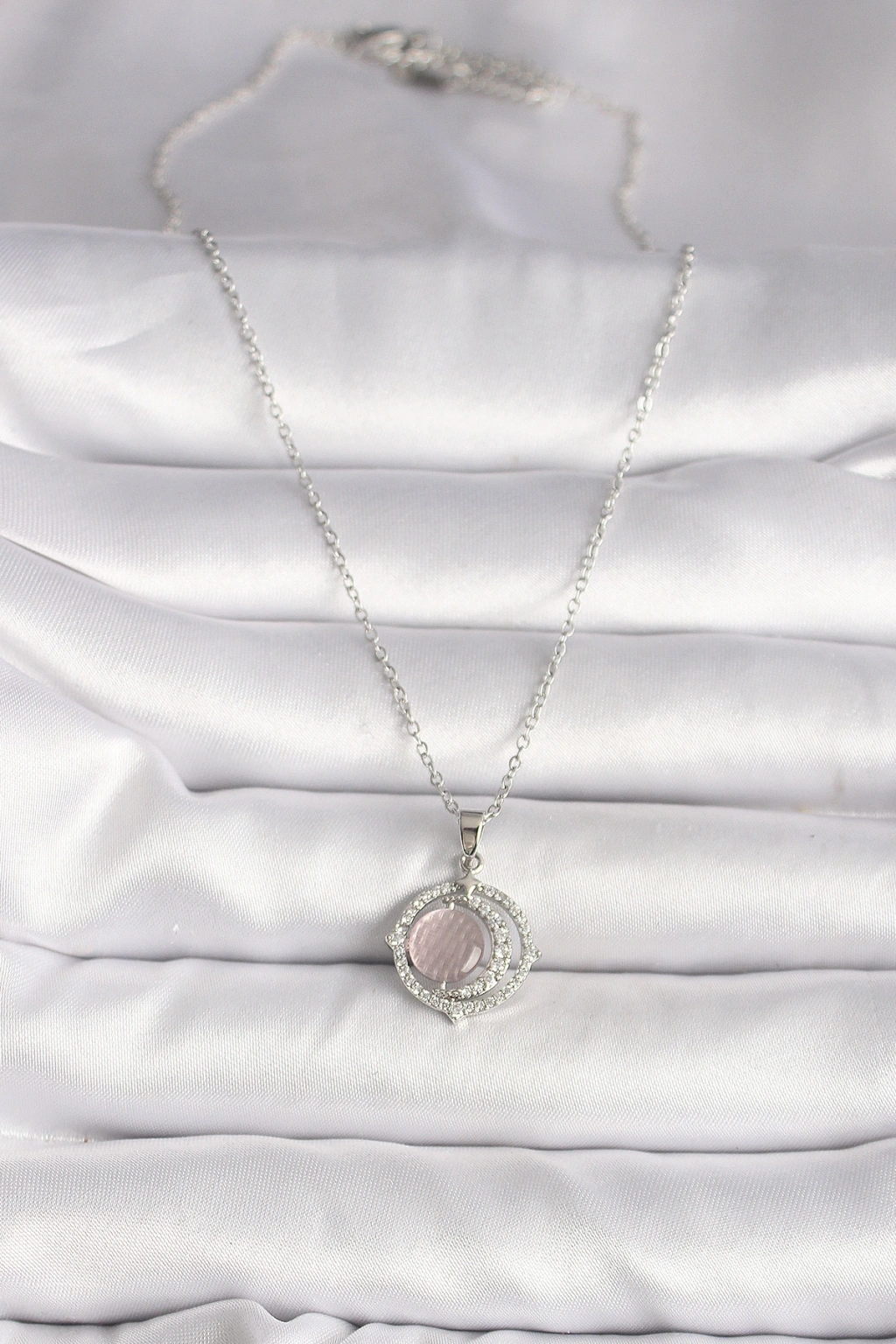 316l Çelik Gümüş Renk Zirkon Taşlı Pembe Sedefli Hilal Model Kadın Kolye