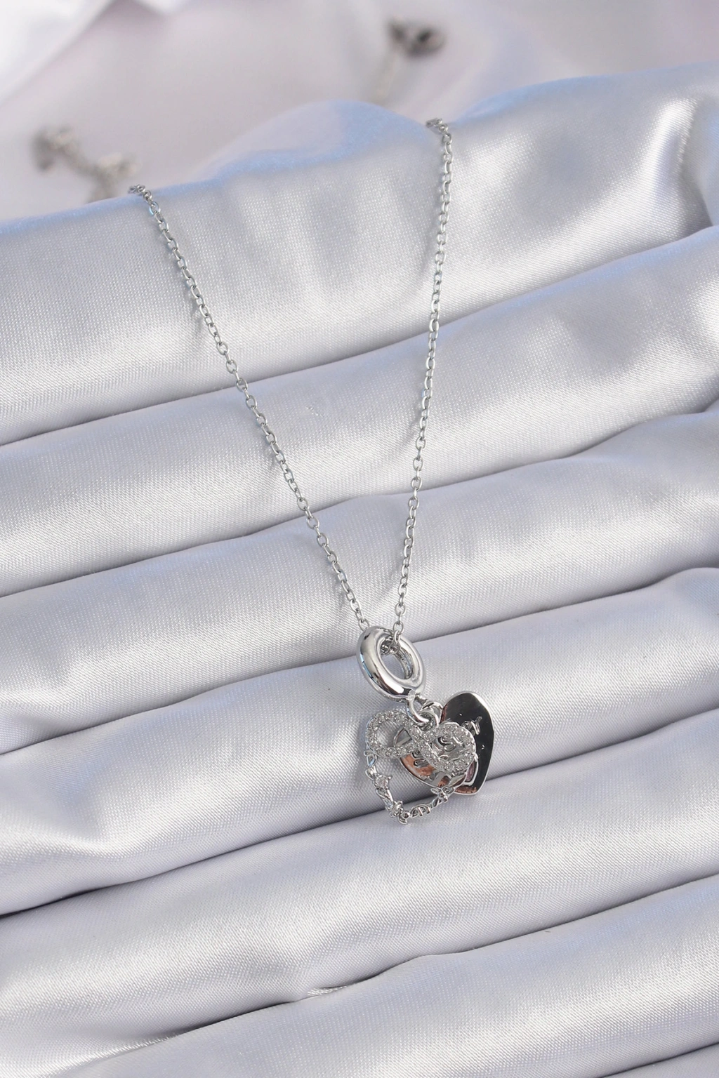 316L Çelik Gümüş Renk Zincir Zirkon Taşlı Düğüm Sallantı Kalp Figür Kadın Kolye