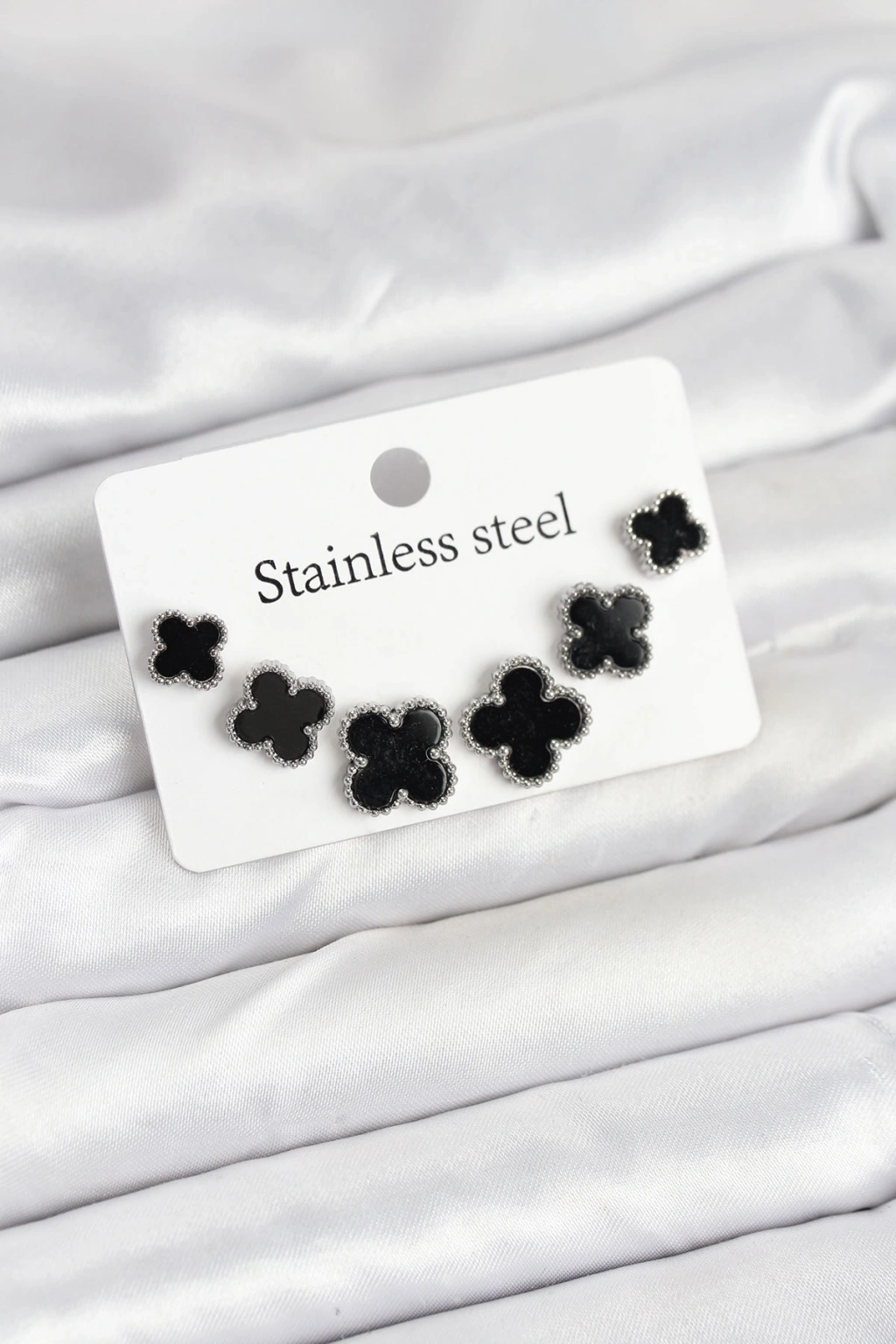 316L Çelik Gümüş Siyah Renk 3 Boy Yonca Küpe Seti
