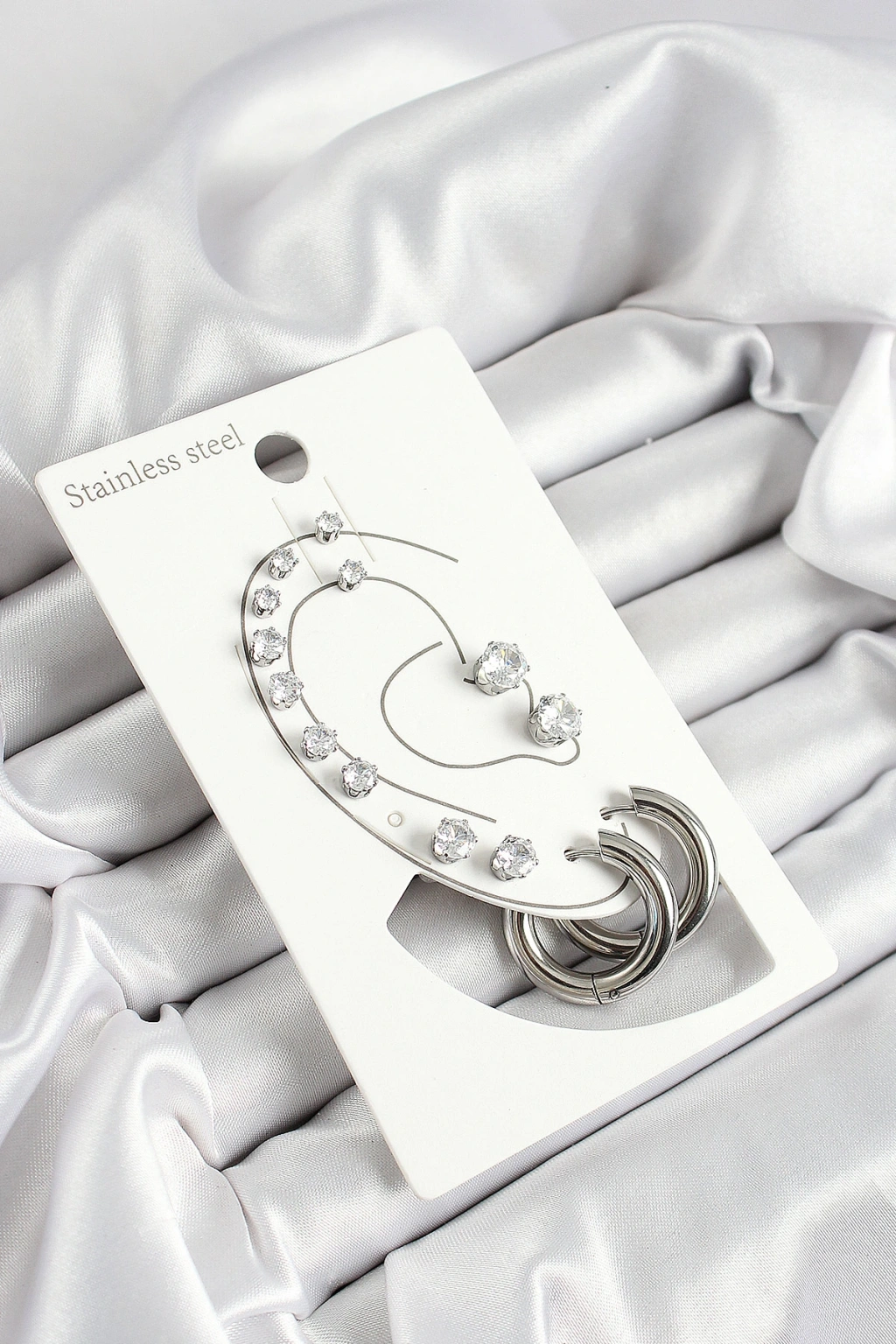316l Çelik Halka Figürlü Ve Zirkon Taşlı Gümüş Renk 7'li Çift Kadın Küpe Set