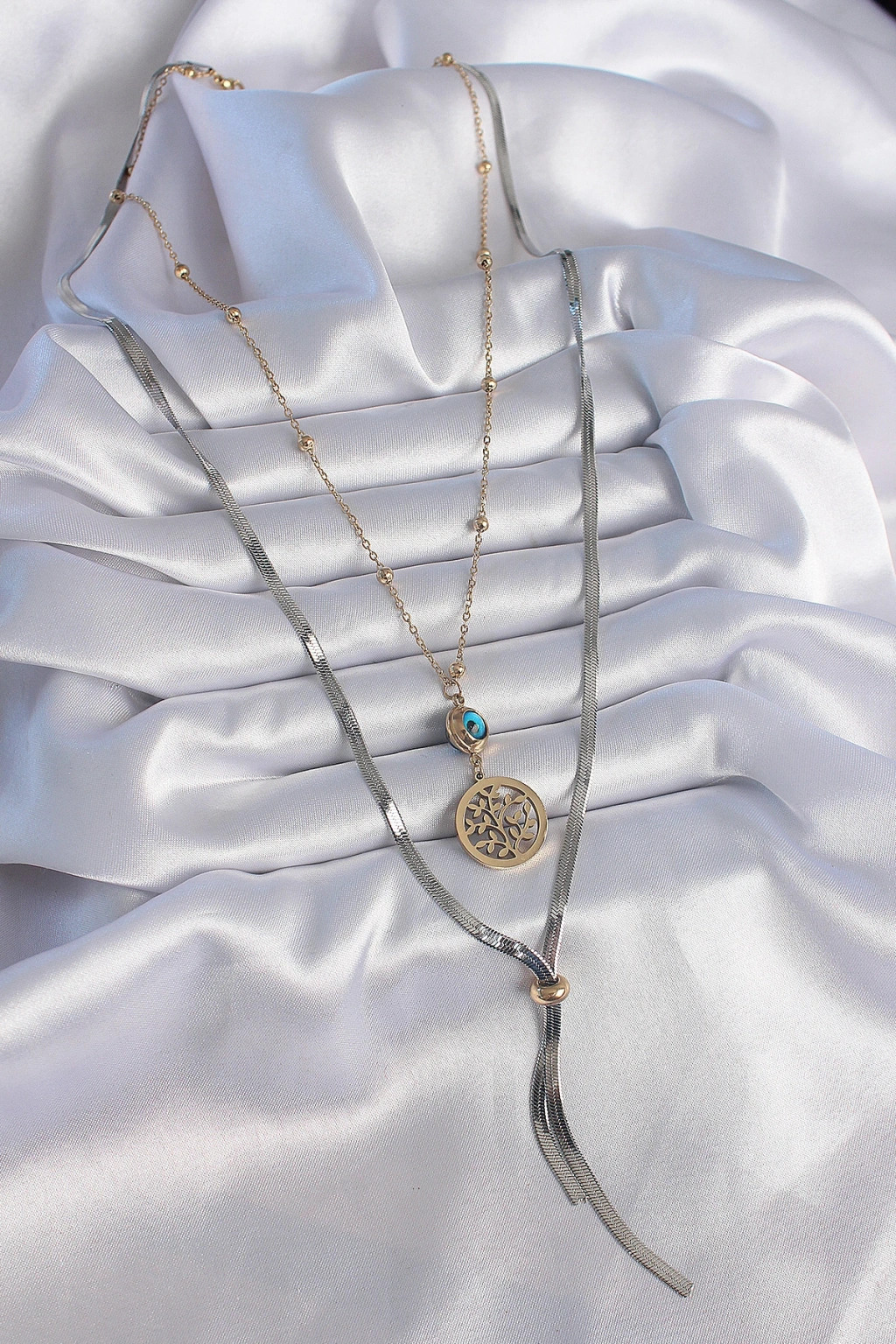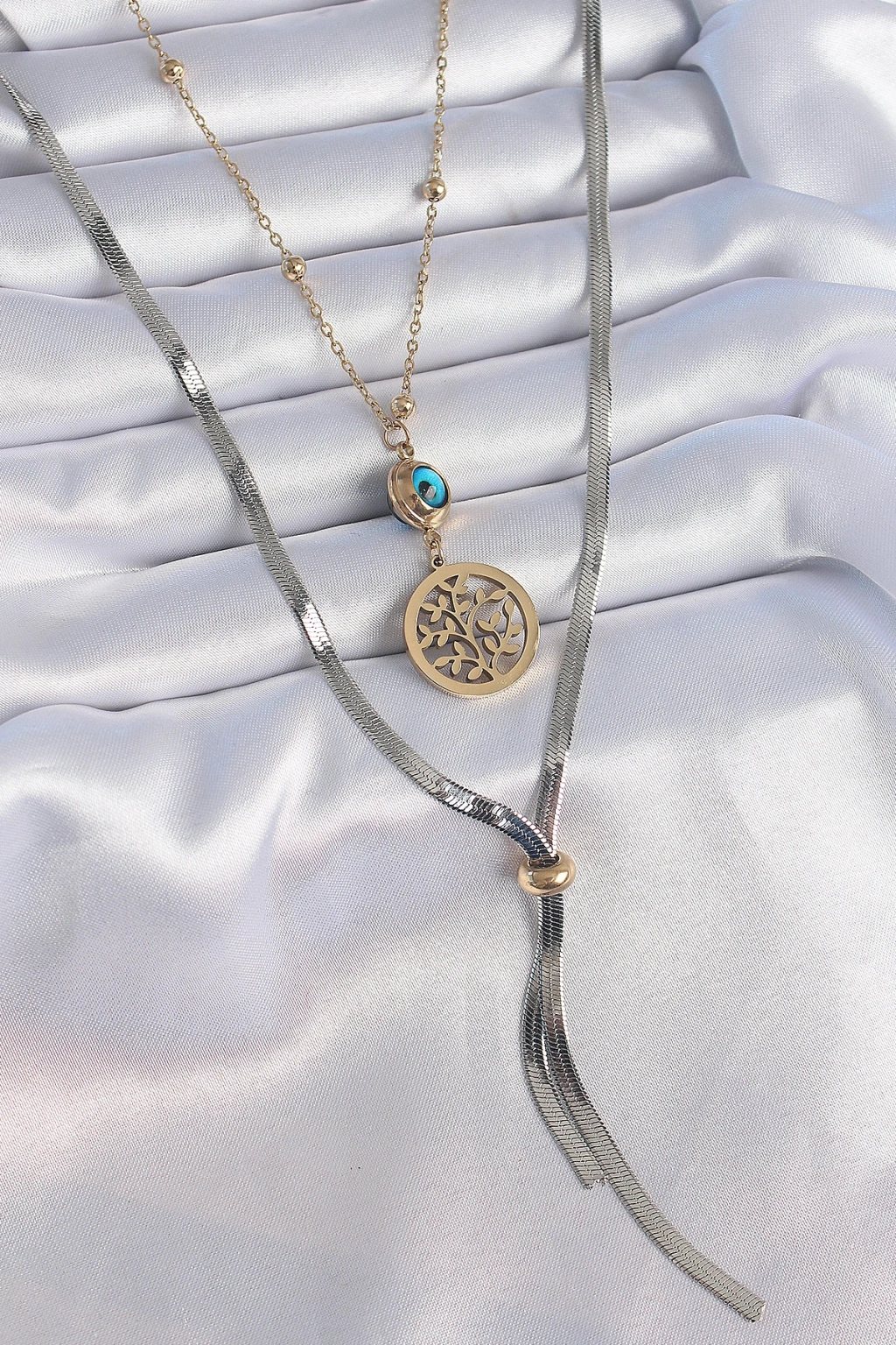 316l Çelik Mix Renk Filiz Figür Nazar Boncuk Detay Uzun Kadın Kolye