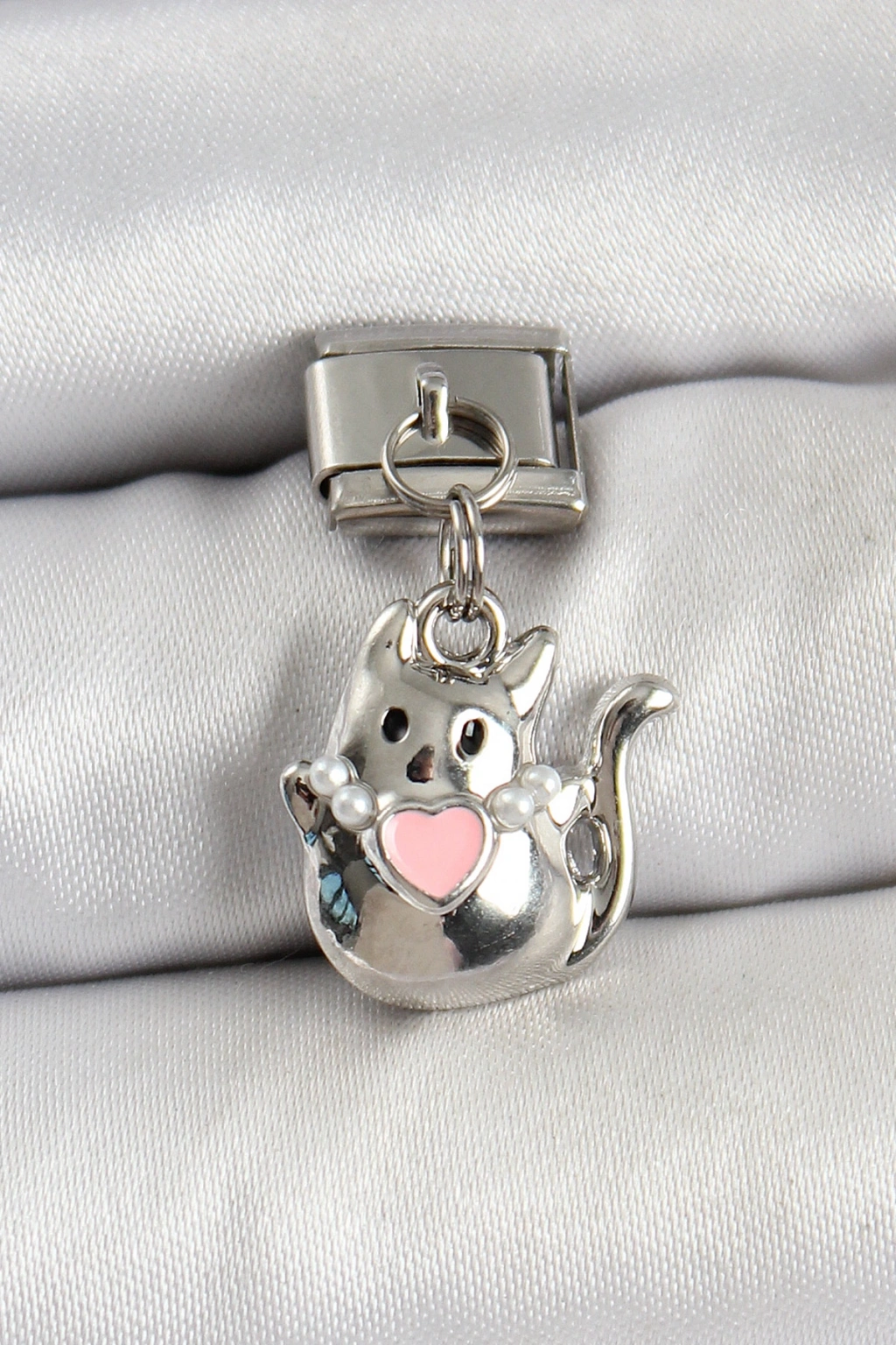 316L Çelik Sallantılı Kalp Detaylı Kedi Model Gümüş Renk Nomination Charm