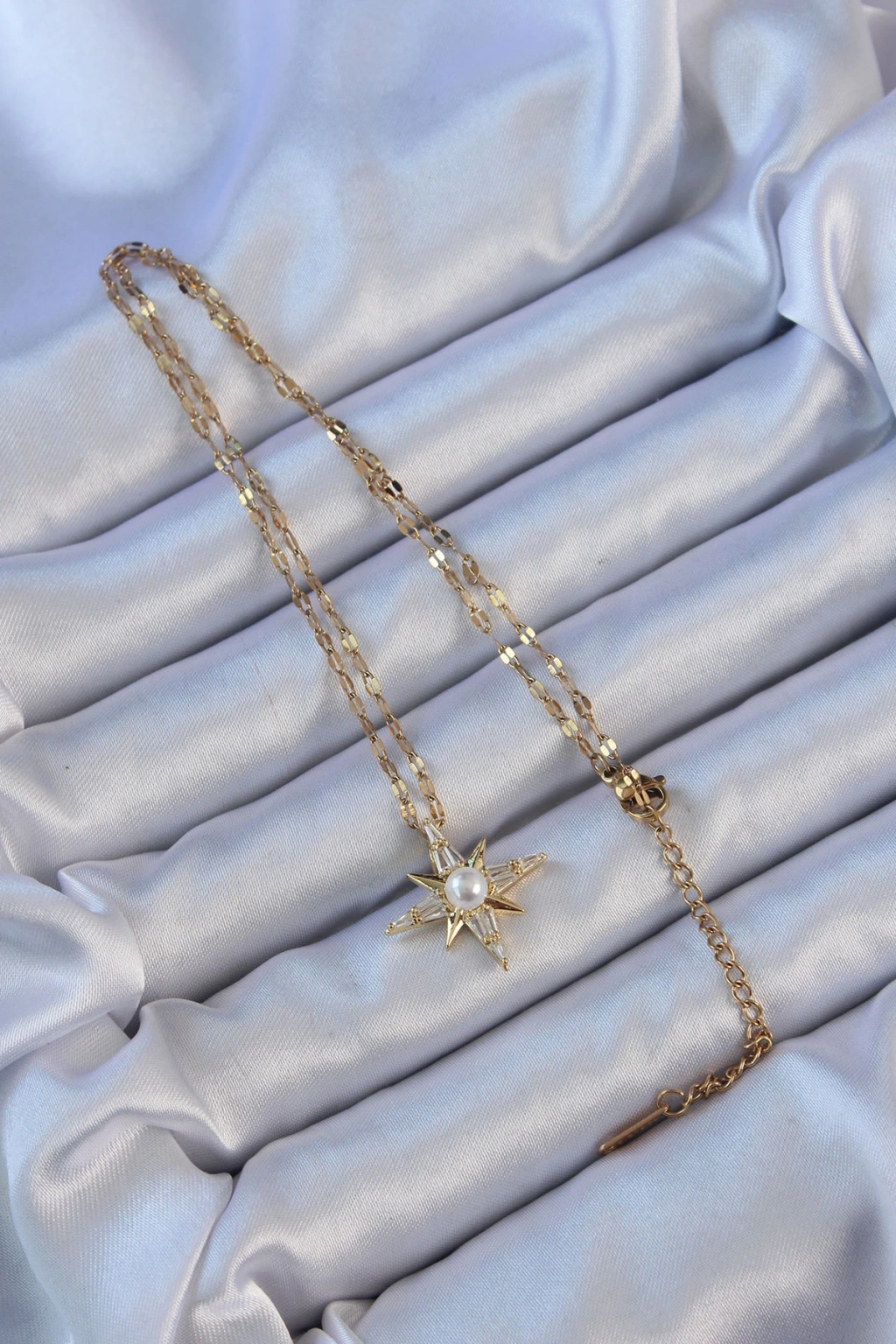 316l Çelik Zincir Altın Renk Baget Taşlı İnci Detay Kutup Yıldızı Kolye