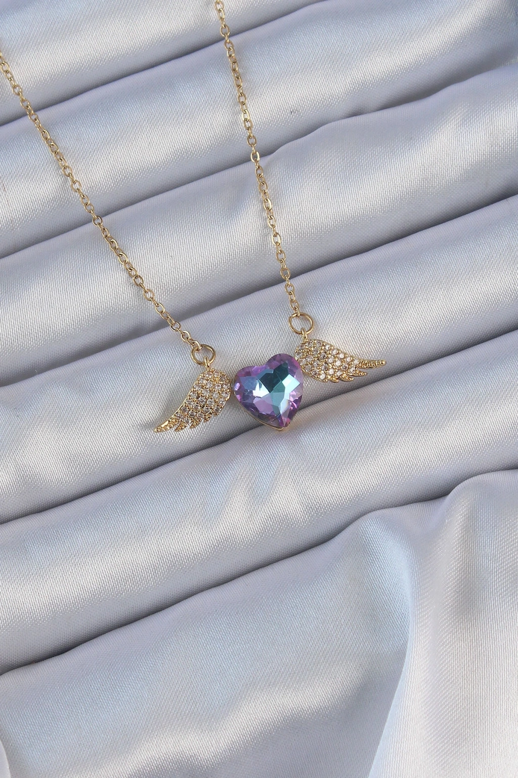 316L Çelik Zincir Altın Renk Mavi Mor Zirkon Taşlı Kanatlı Kalp Kolye