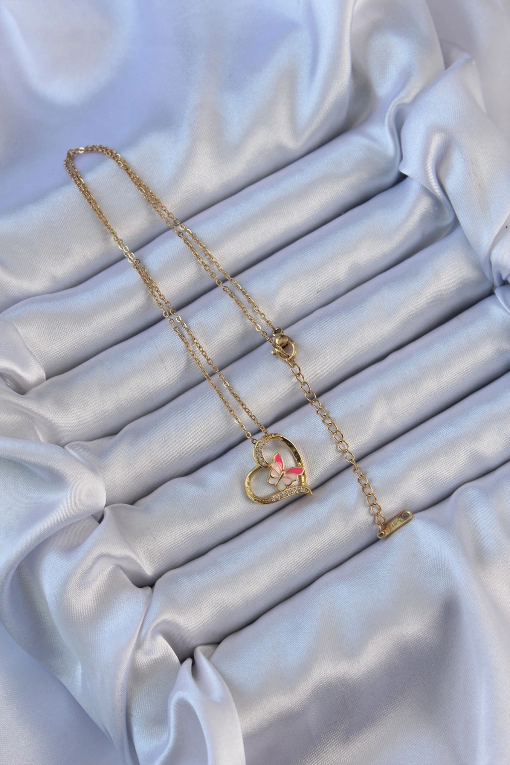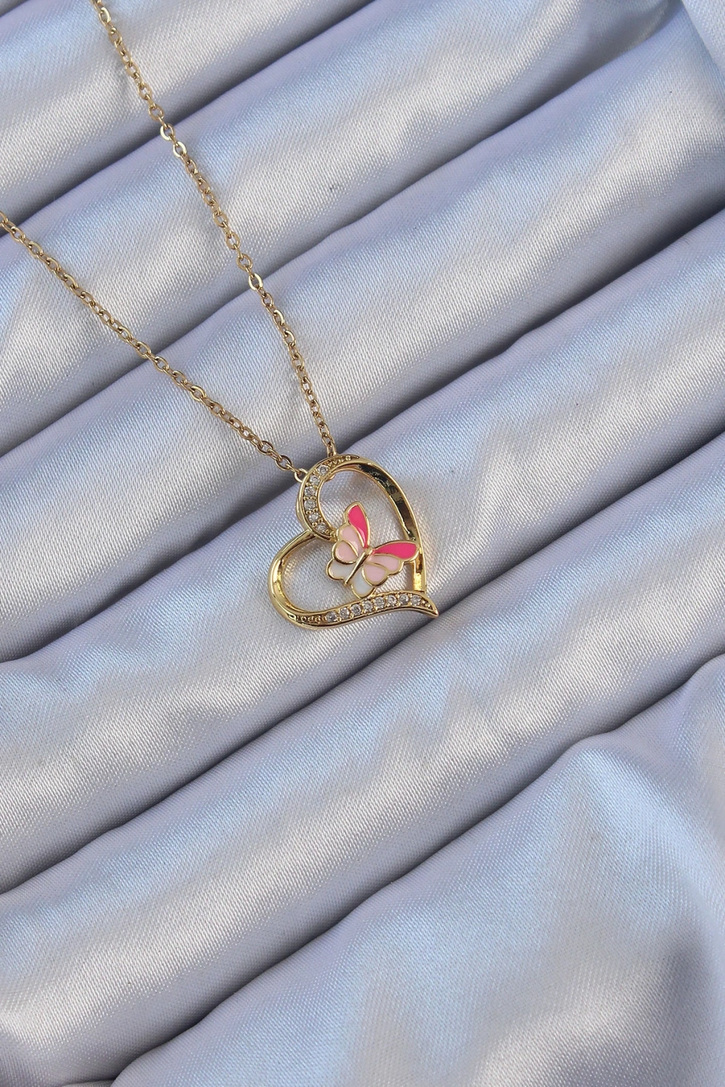 316l Çelik Zincir Altın Renk Mineli Kelebek Figür Zirkon Taşlı Kalp Kolye