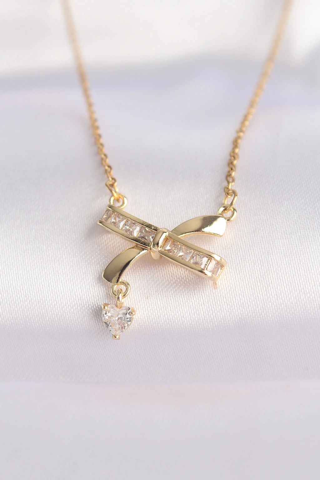 316l Çelik Zincir Altın Renk Zirkon Taşlı Kalp Detay Fiyonk Kolye