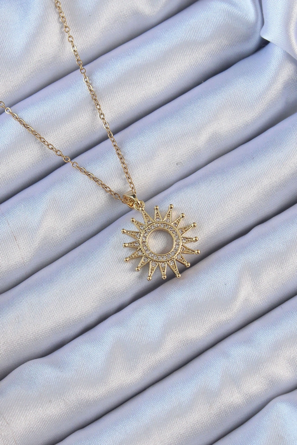 316L Çelik Zincir Altın Renk Zirkon Taşlı Parlayan Güneş Kolye